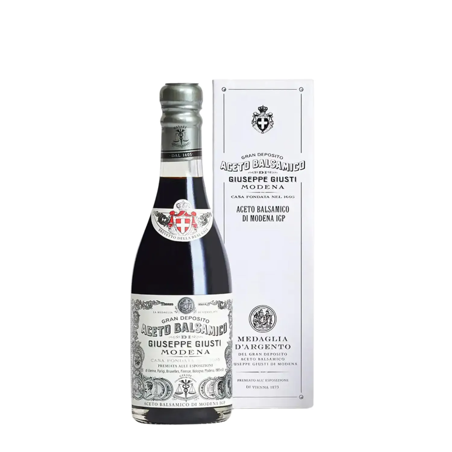 L’Aceto Balsamico di Modena IGP 1 Medaglia d’Argento Champagnotta di Acetaia Giusti è un condimento di eccellenza, caratterizzato da una densità importante (1.19) e da un equilibrio armonioso tra dolce e agro. Prodotto con mosto d’uva cotto e aceto di vino, viene lasciato maturare in botti di legno, sprigionando note fruttate, speziate e balsamiche. Perfetto per esaltare i piatti più raffinati, è sinonimo di tradizione e qualità.