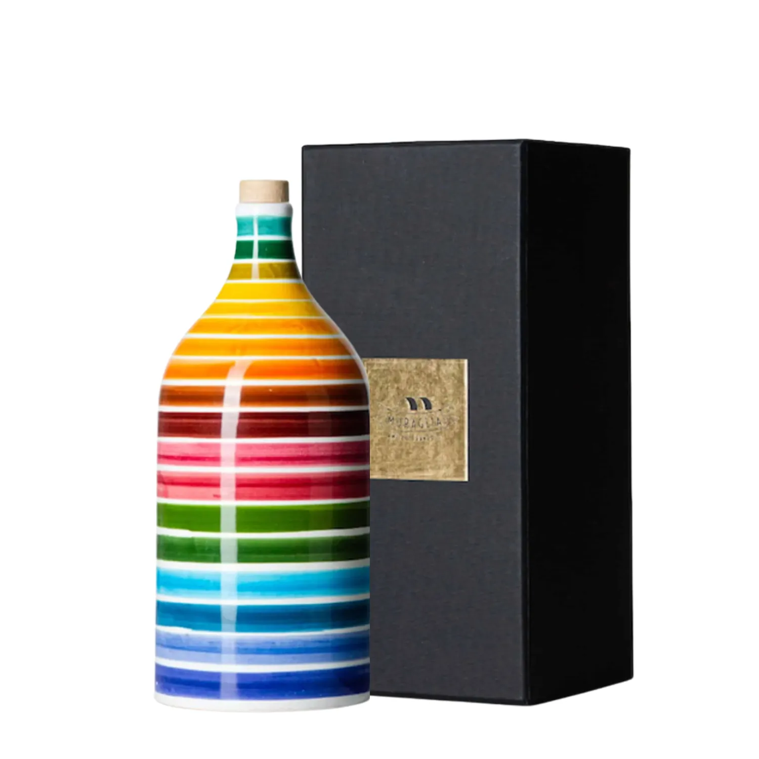 L’Olio Extravergine di Oliva “Arcobaleno” Astucciato da 1,5 litri è un omaggio all’arte, alla tradizione e all’eccellenza gastronomica italiana. Racchiuso in una maestosa bottiglia in ceramica dipinta a mano, questo olio extravergine fruttato intenso è ottenuto da olive 100% Coratina, coltivate nel cuore della Puglia e spremute a freddo entro 24 ore dalla raccolta. Profondo nei sentori erbacei e speziati, si distingue per l’equilibrio dei toni vegetali e la lunga persistenza al palato. Un oggetto da collezione e una riserva di gusto per veri intenditori.