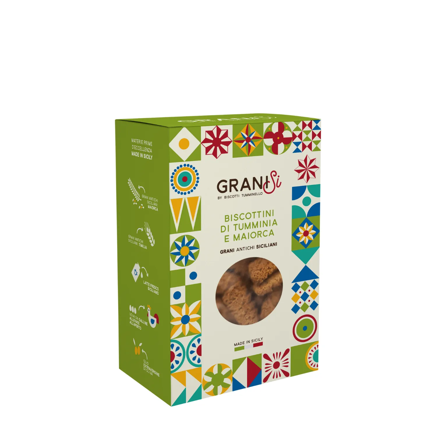 I Biscottini di Tumminia e Maiorca della linea Granisì Tumminello sono preparati con farine di grani antichi siciliani (Tumminia e Maiorca), zucchero di canna, uova fresche e burro, con aggiunta di olio extravergine di oliva. Un biscotto genuino dal gusto autentico, che valorizza la tradizione siciliana e i sapori dei grani locali.