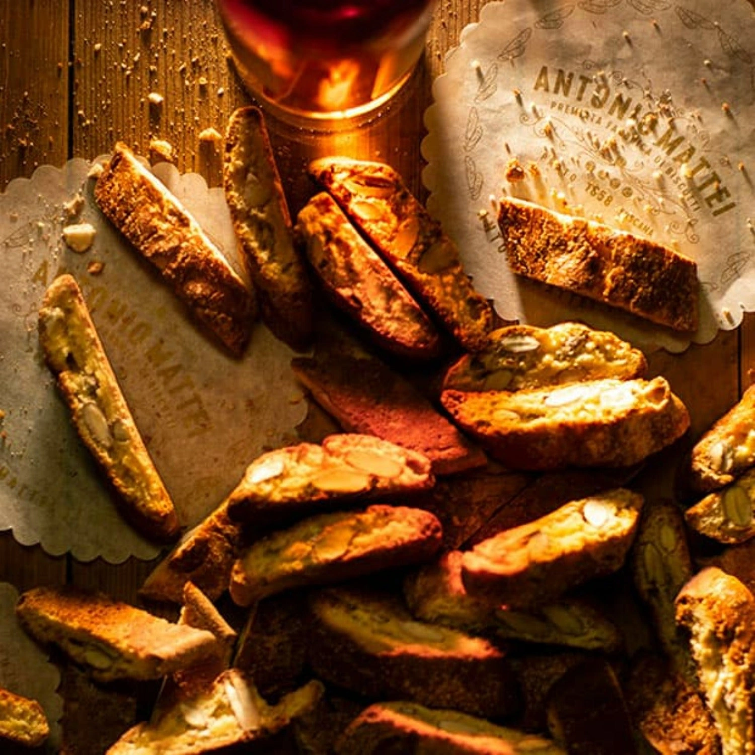 I Biscotti di Prato, comunemente noti come cantucci o cantuccini alle mandorle, fanno parte della tradizione culinaria toscana che li vede come perfetto fine pasto in abbinamento al Vin Santo.