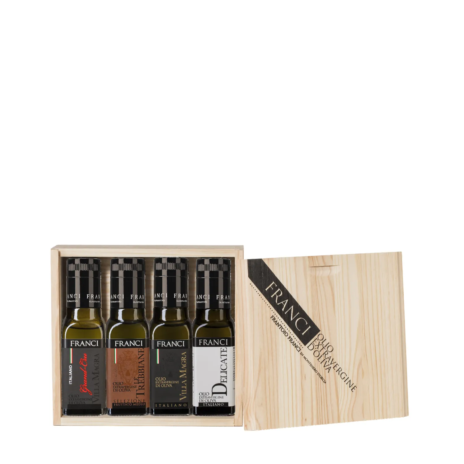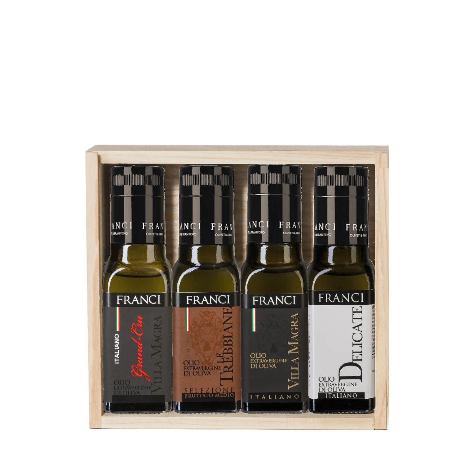 La Cassetta di Legno delle Selezioni Franci è un’elegante idea regalo che racchiude quattro bottiglie da 100 ml di pregiati oli extravergini di oliva toscani. Ogni olio, autentico e di alta qualità, rappresenta un’esperienza sensoriale unica.