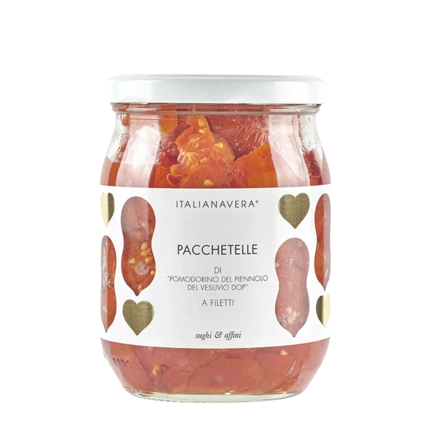 Le pacchetelle sono l’antico metodo, utilizzato dalle donne vesuviane, di conservare tutto l’anno i pomodorini raccolti tra i mesi di luglio ed agosto. I frutti venivano suddivisi in grappoli e messi ad essiccare oppure tagliati a metà di lungo e pastorizzati a bagnomaria. E, come un tempo, vengono lavorati e conservati ancora così.