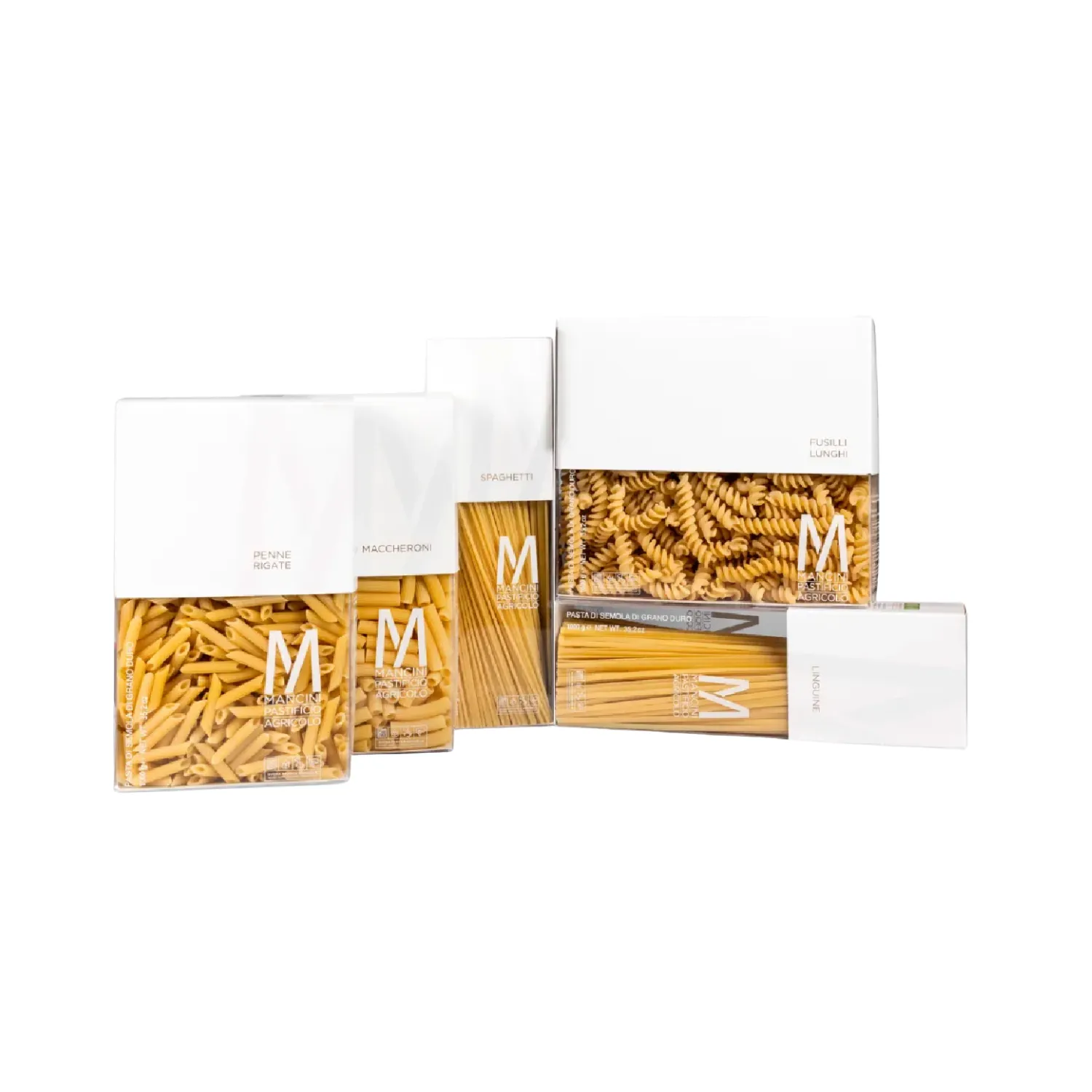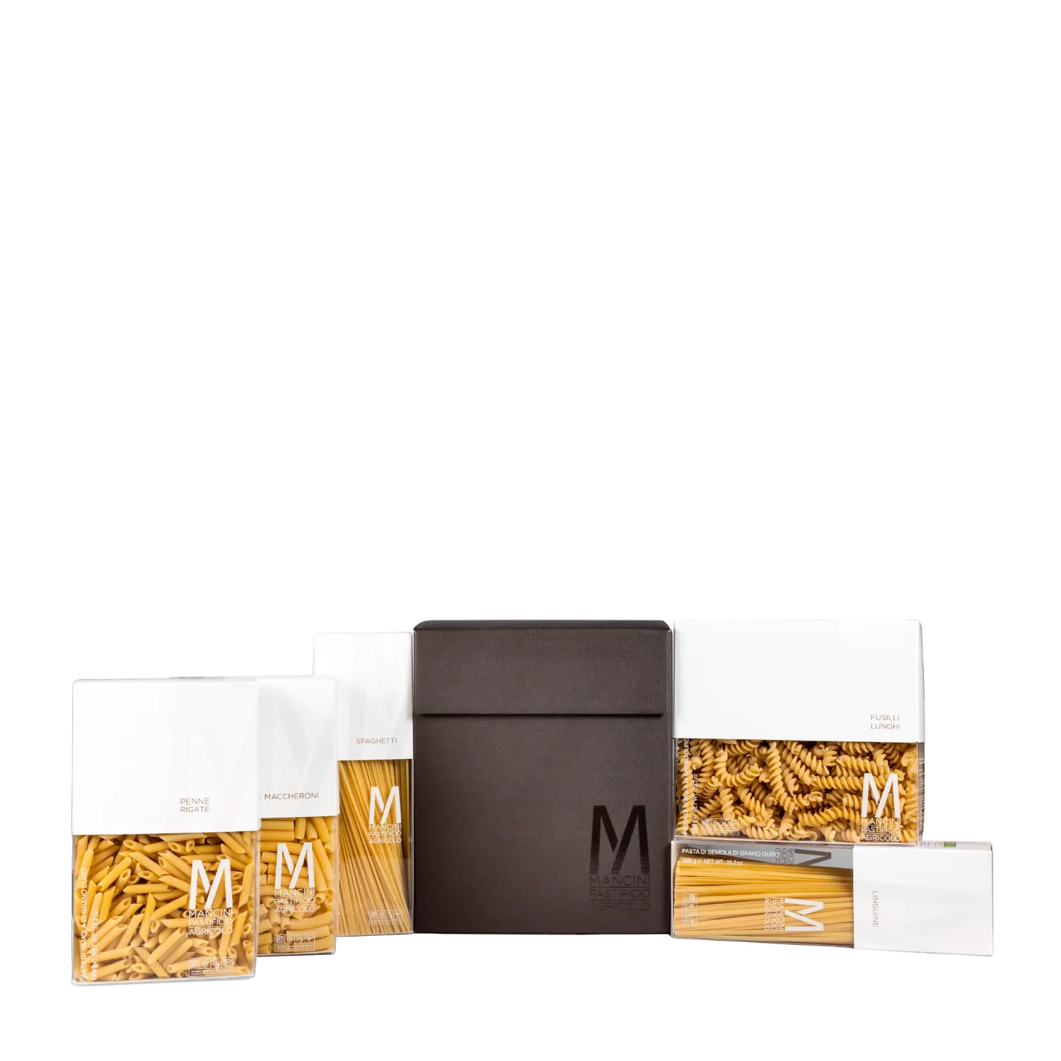 Il Cubo Mini di Pasta Mancini è un elegante bauletto pensato per valorizzare il design essenziale degli astucci trasparenti da 1 kg. All’interno racchiude 5 kg di pasta Linea Classica nei formati più iconici: Linguine, Spaghetti, Fusilli Lunghi, Maccheroni e Penne Rigate. Una confezione regalo raffinata e completa, ideale per chi desidera portare in tavola tutta la qualità di Pasta Mancini in una selezione prestigiosa.