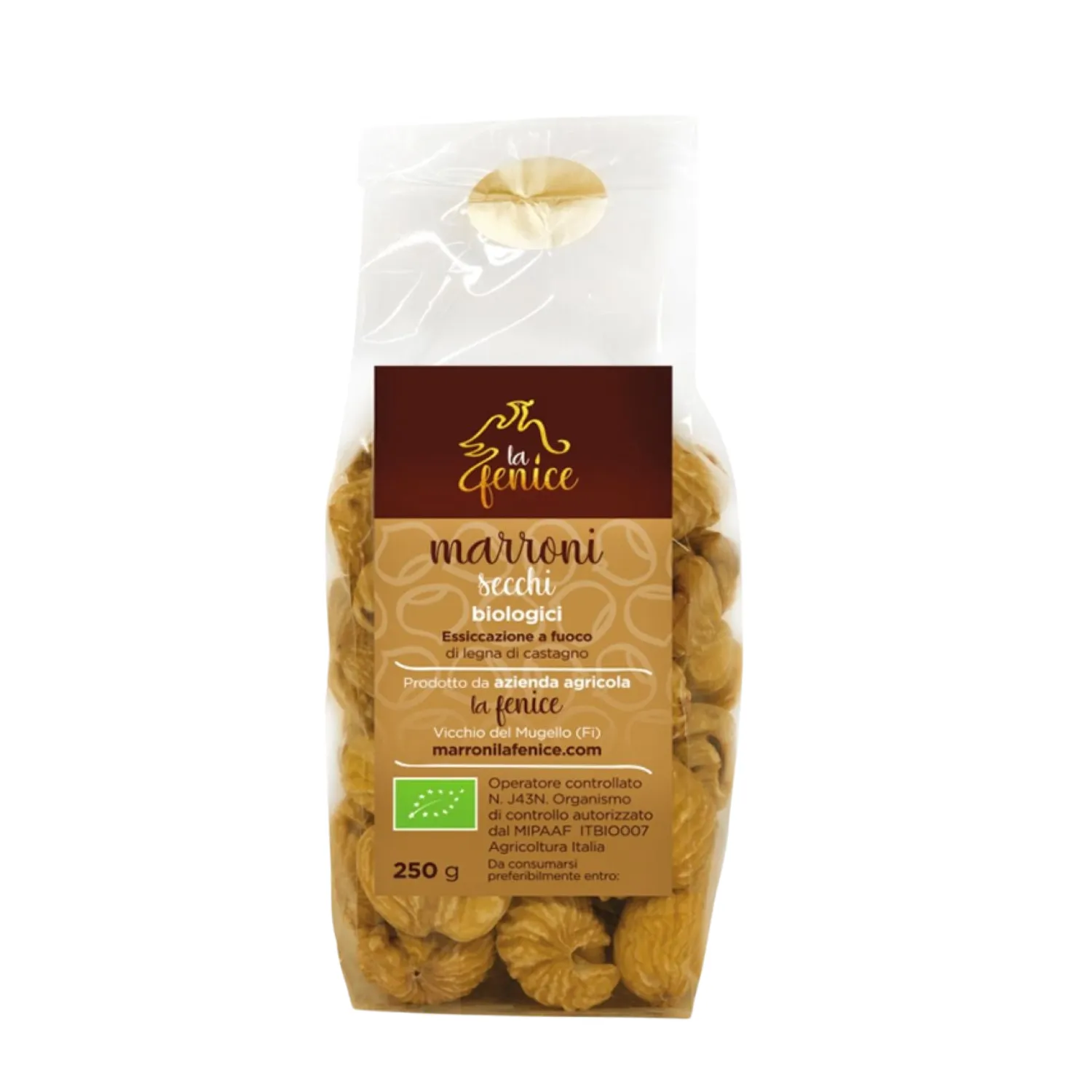 I migliori marroni secchi vengono selezionati con cura e confezionati a parte per offrire sapore e piacere in qualsiasi momento della giornata. Un tempo “caramelle dei nonni” e “chicche” per non far piangere i bambini, impreziosiscono con il loro sapore intenso minestre e zuppe, da soli o con aggiunta di legumi e verdure. La produzione dei marroni secchi segue un metodo millenario di essiccazione. I marroni appena raccolti vengono depositati su una “cannicciaia” (palco traforato) all’interno di un “metato” o “seccatoio”, tradizionale struttura in pietra generalmente murata a secco. Nel vano sottostante viene acceso un basso fuoco di legna di castagno che rimane acceso per circa sei settimane. I marroni, una volta seccati, vengono rimossi dalla “cannicciaia” e battuti per separare il frutto dal guscio. Vengono poi selezionati uno ad uno attraverso un’attenta cernita manuale, l’unica che garantisca realmente l’alta qualità nel prodotto finito.