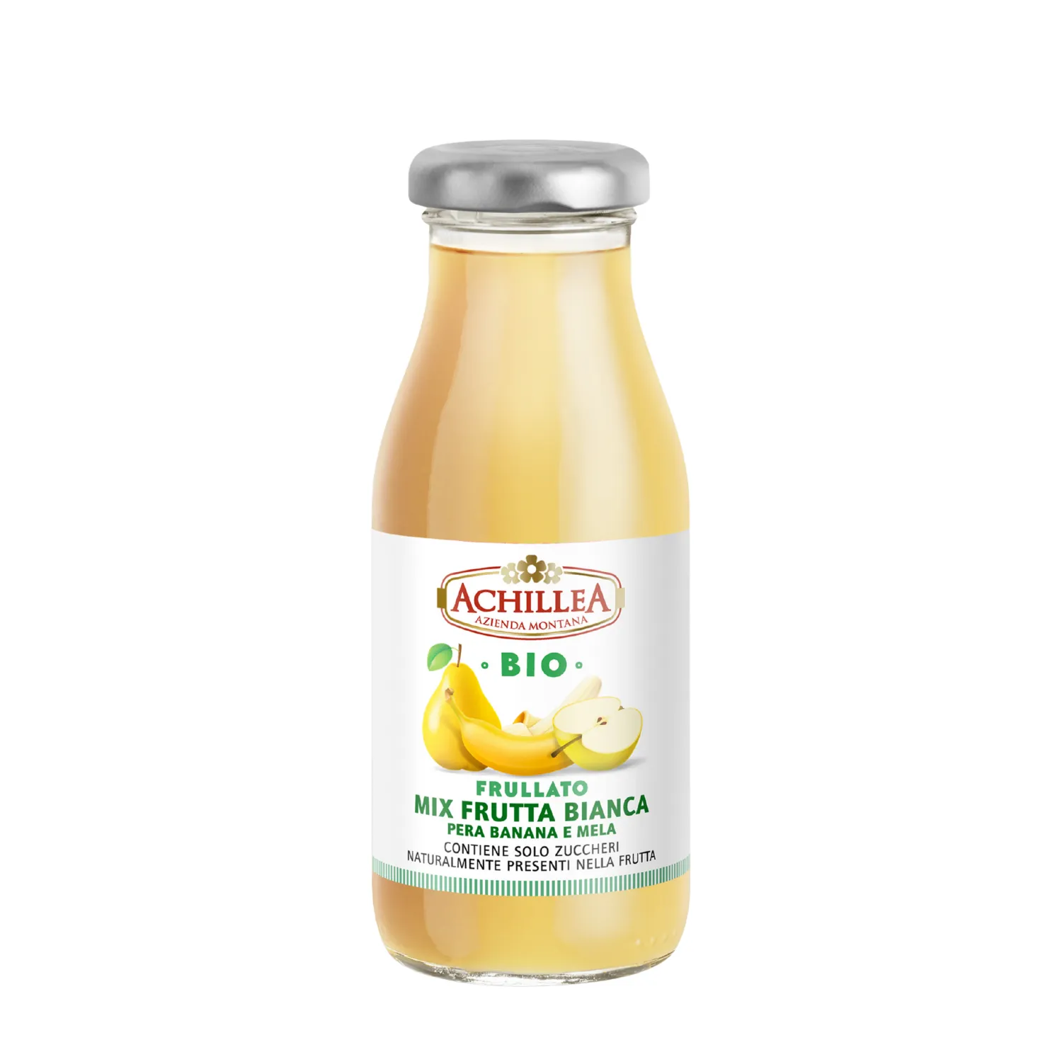 Il Frullato di Frutta Bianca Achillea è una bevanda biologica ottenuta da purea e succhi concentrati di pera Williams, mela e banana. Dalla consistenza densa e cremosa, si distingue per il colore bianco avorio e l’aroma fruttato con note dolci di banana. Perfetto per la colazione o come spuntino naturale, è adatto a tutti grazie alla sua formulazione senza OGM e senza allergeni.