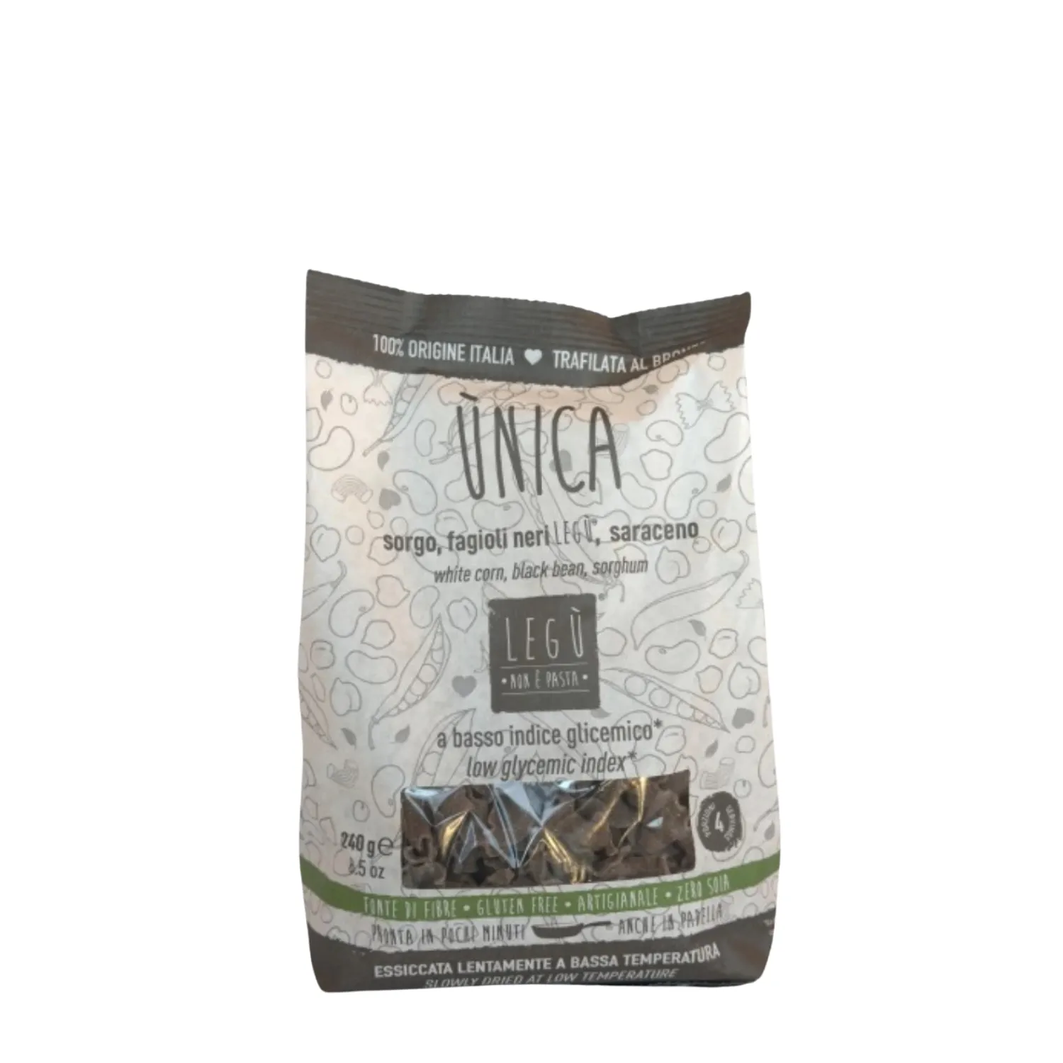 Questa pasta è a base di legumi e ricca di fibre e proteine grazie all’utilizzo di mais bianco, fagioli neri cotti a vapore, germe di saraceno, sorgo cotto a vapore e grano saraceno integrale.