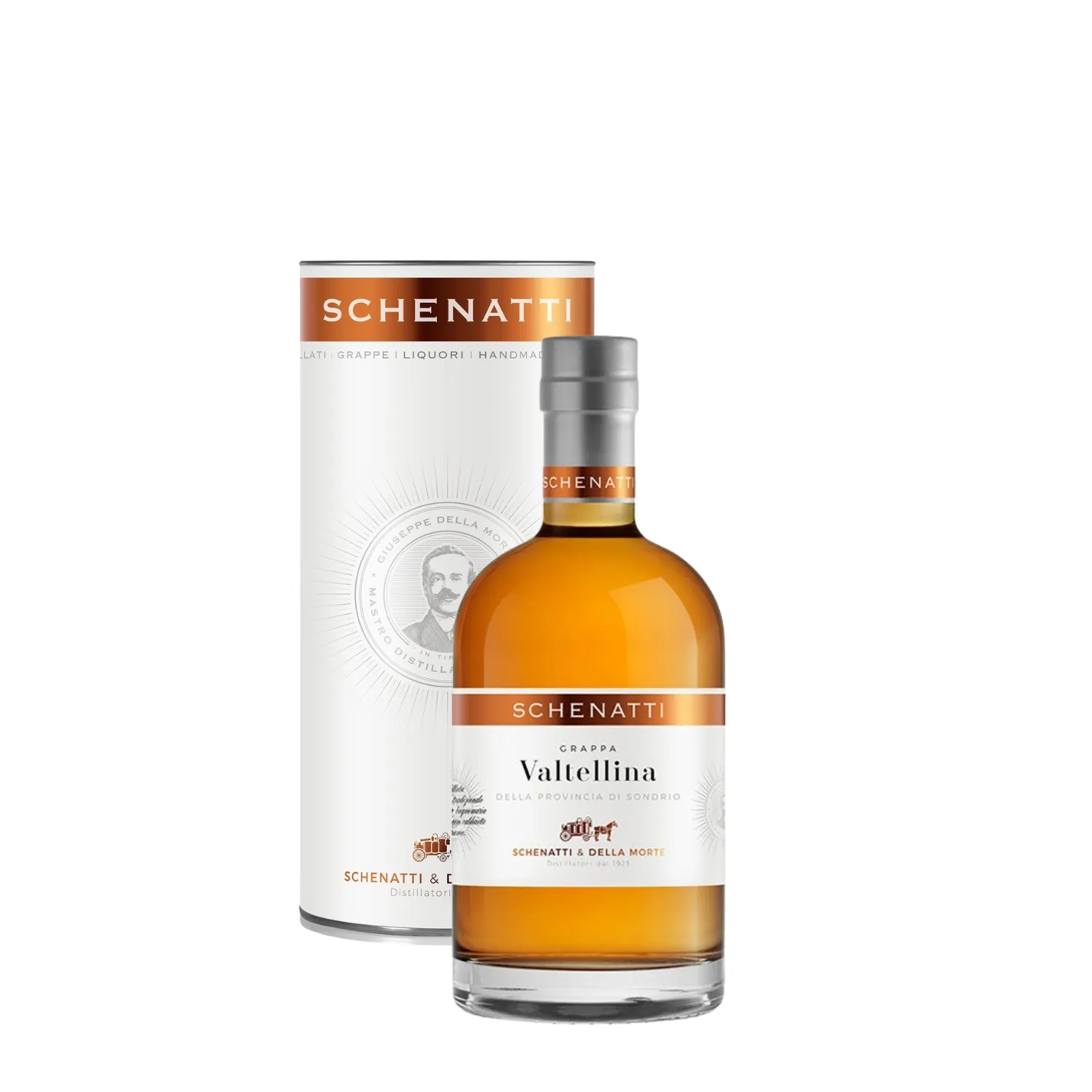 La Grappa Valtellina Barrique di Schenatti, ottenuta con il tradizionale metodo discontinuo di impianto a bagnomaria, è ricavata dalla distillazione delle vinacce fresche dei nobili vini di Valtellina D.O.C. – I.G.T. e Terrazze Retiche della provincia di Sondrio.