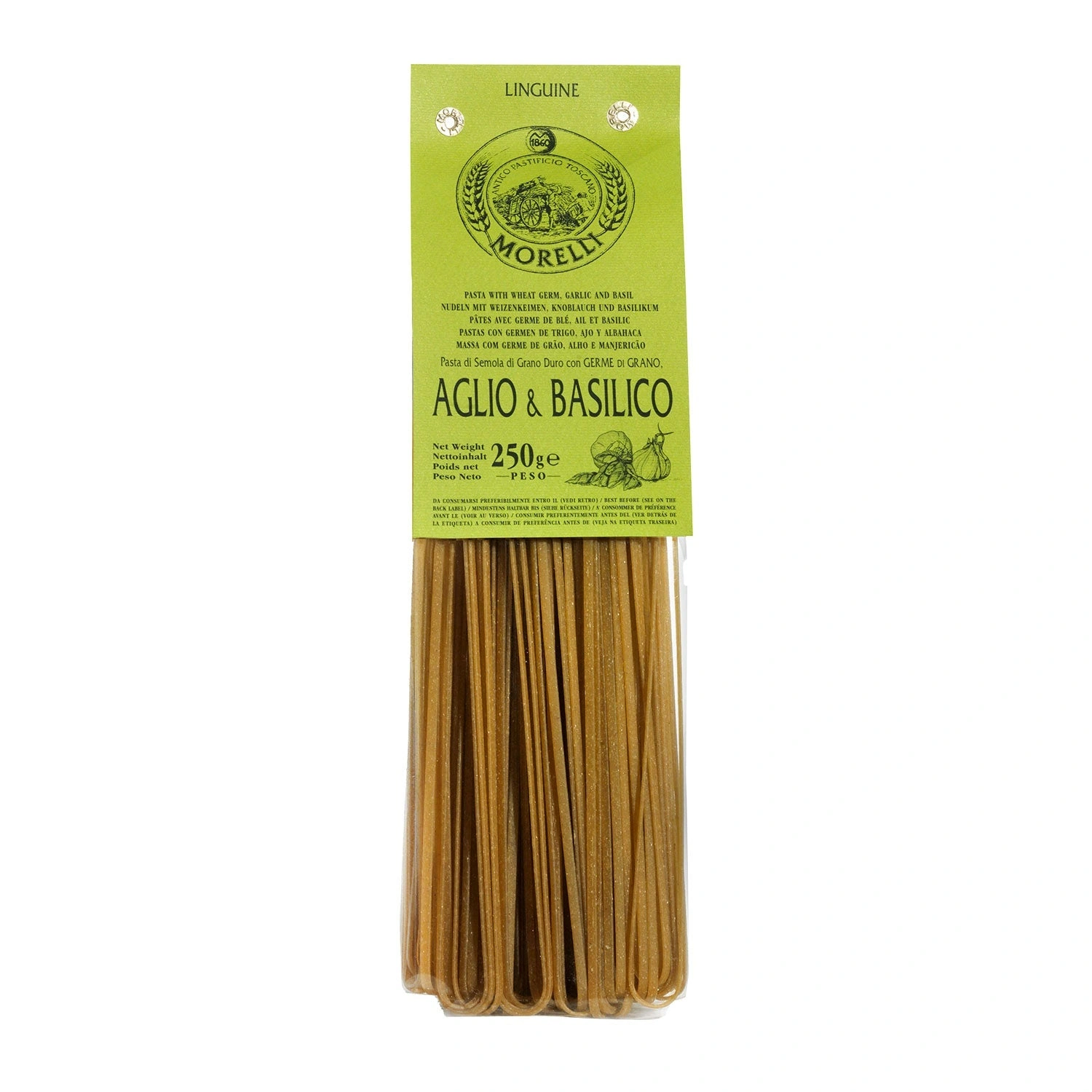 Le linguine aglio e basilico del Pastificio Morelli, antica azienda toscana, sono una pasta arricchita da due ingredienti speciali, i veri protagonisti del classico pesto alla genovese. L’aglio e il basilico sono mescolati direttamente nell’impasto e profumano le linguine in maniera irresistibile, senza dover ricorrere ad ulteriori condimenti.