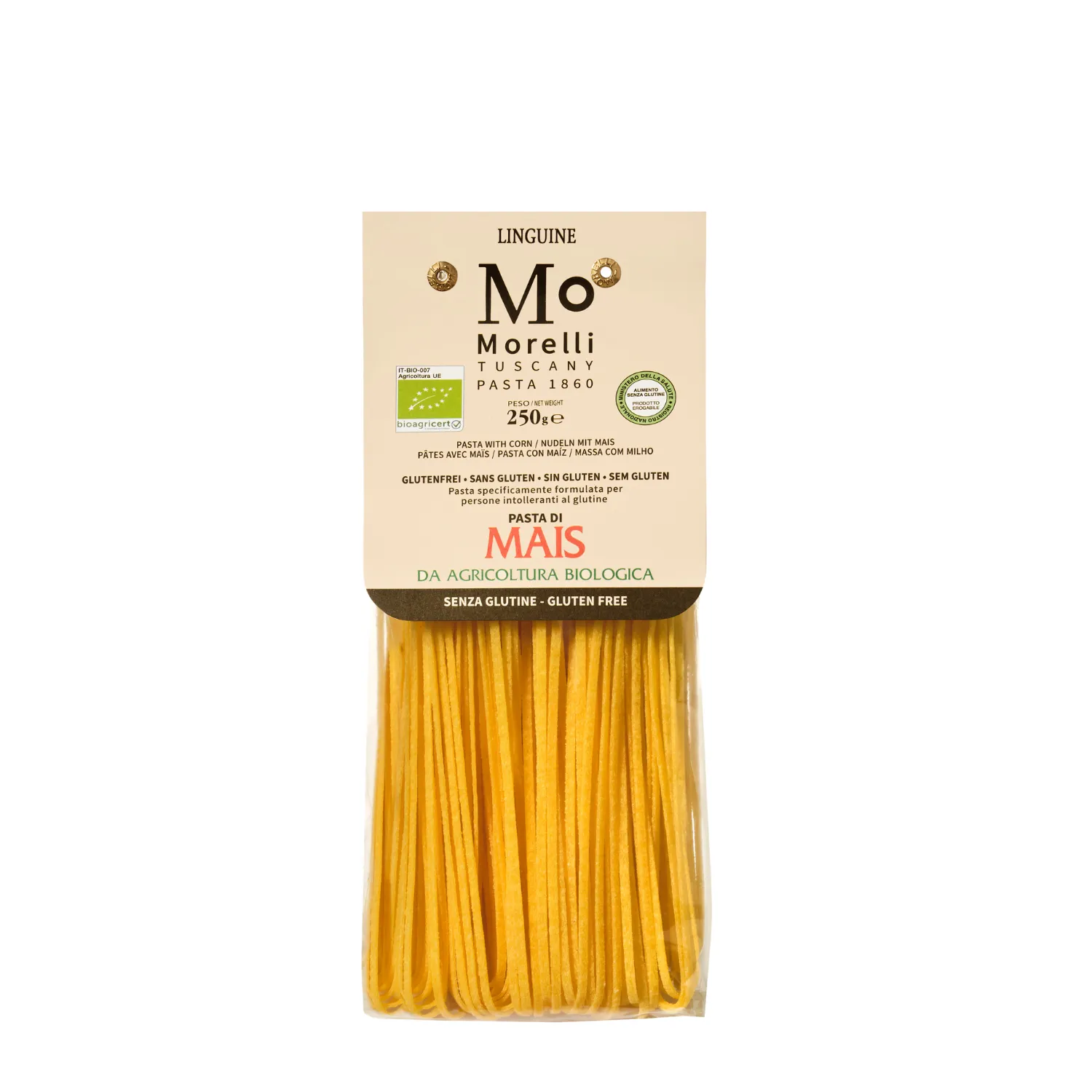 Le Linguine di Mais BIO di Antico Pastificio Morelli sono una specialità alimentare senza glutine, realizzata esclusivamente con farina di mais biologica e acqua. Dal colore giallo intenso e dal sapore naturalmente dolce, offrono una consistenza corposa e un’ottima tenuta in cottura. Ideali per chi cerca un’alternativa gluten free senza rinunciare al gusto autentico della pasta artigianale. Tempo di cottura: 9 minuti.