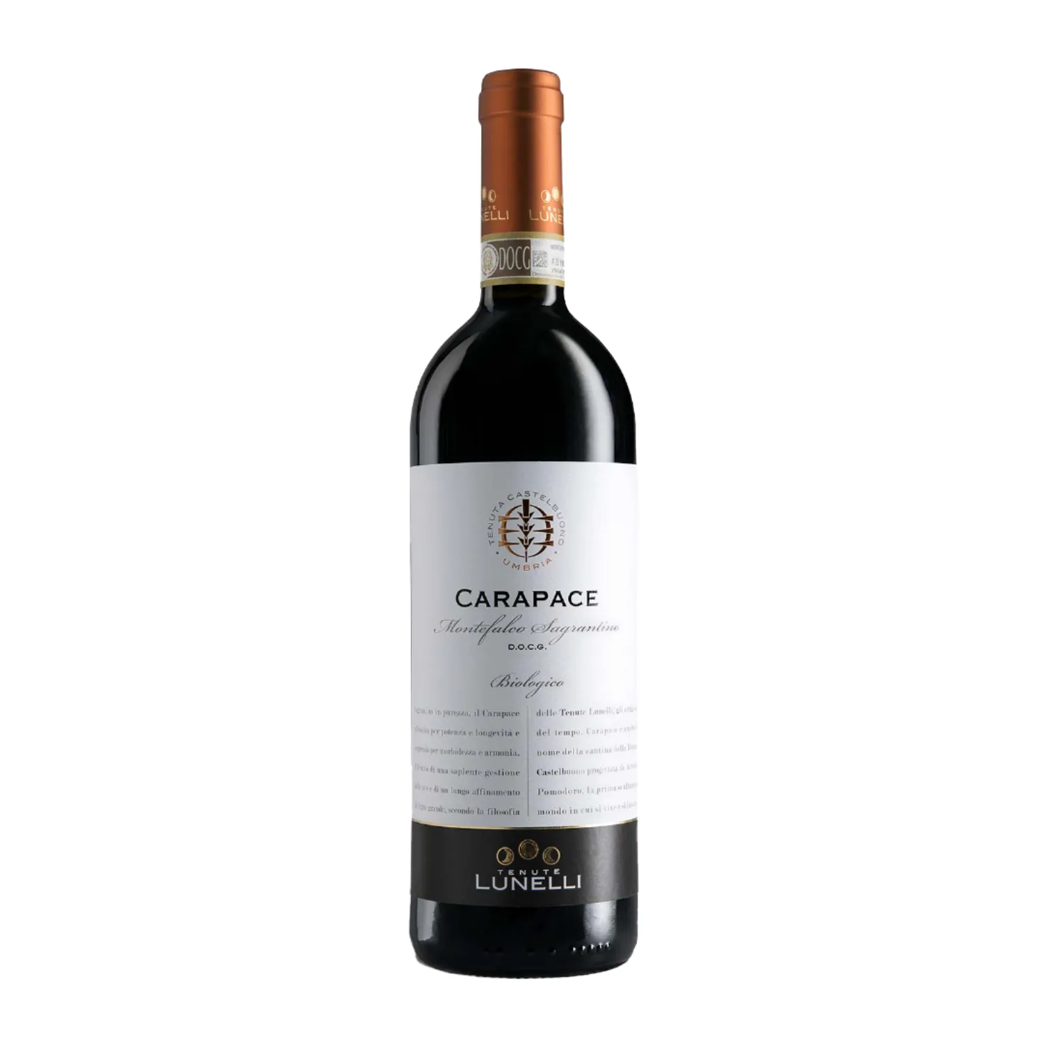 Il Montefalco Sagrantino DOCG Carapace delle Tenute Lunelli è un vino straordinario, biologico, nato dai migliori vigneti di Montefalco e Bevagna, selezionati nell’ambito del “Progetto Patriarchi”. Prodotto da uve Sagrantino in purezza, raccolte a mano in ottobre, si distingue per la sua potenza e longevità. Dopo una premacerazione a freddo e fermentazione in tini di legno a temperatura controllata, il vino macera per 15–20 giorni. Segue un lungo affinamento di 24 mesi in botte grande e almeno 12 mesi in bottiglia. Di colore rosso rubino intenso e luminoso, al naso esprime un bouquet ricco di confettura di more e mirtilli, ciliegia sotto spirito, carruba, petali di rosa, liquirizia e cioccolato. Al gusto è sontuoso, potente e avvolgente, con tannini finissimi e straordinaria eleganza. Ideale per l’invecchiamento e grandi occasioni gastronomiche.