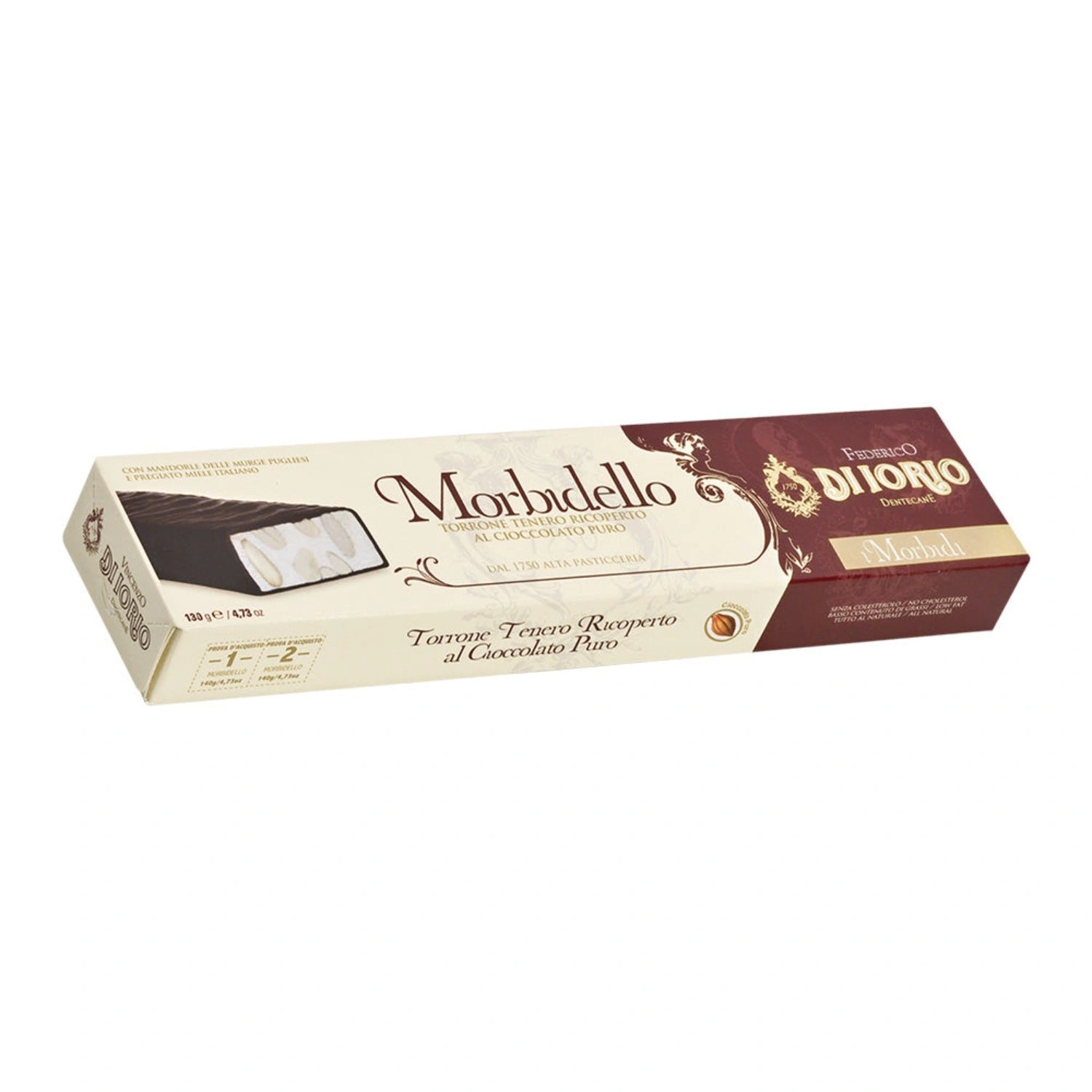 Torrone morbido alle mandorle ricoperto di cioccolato fondente, si presenta ricco di frutta secca, molto delicato al palato, predominano gli aromi tipici del miele chiaro.