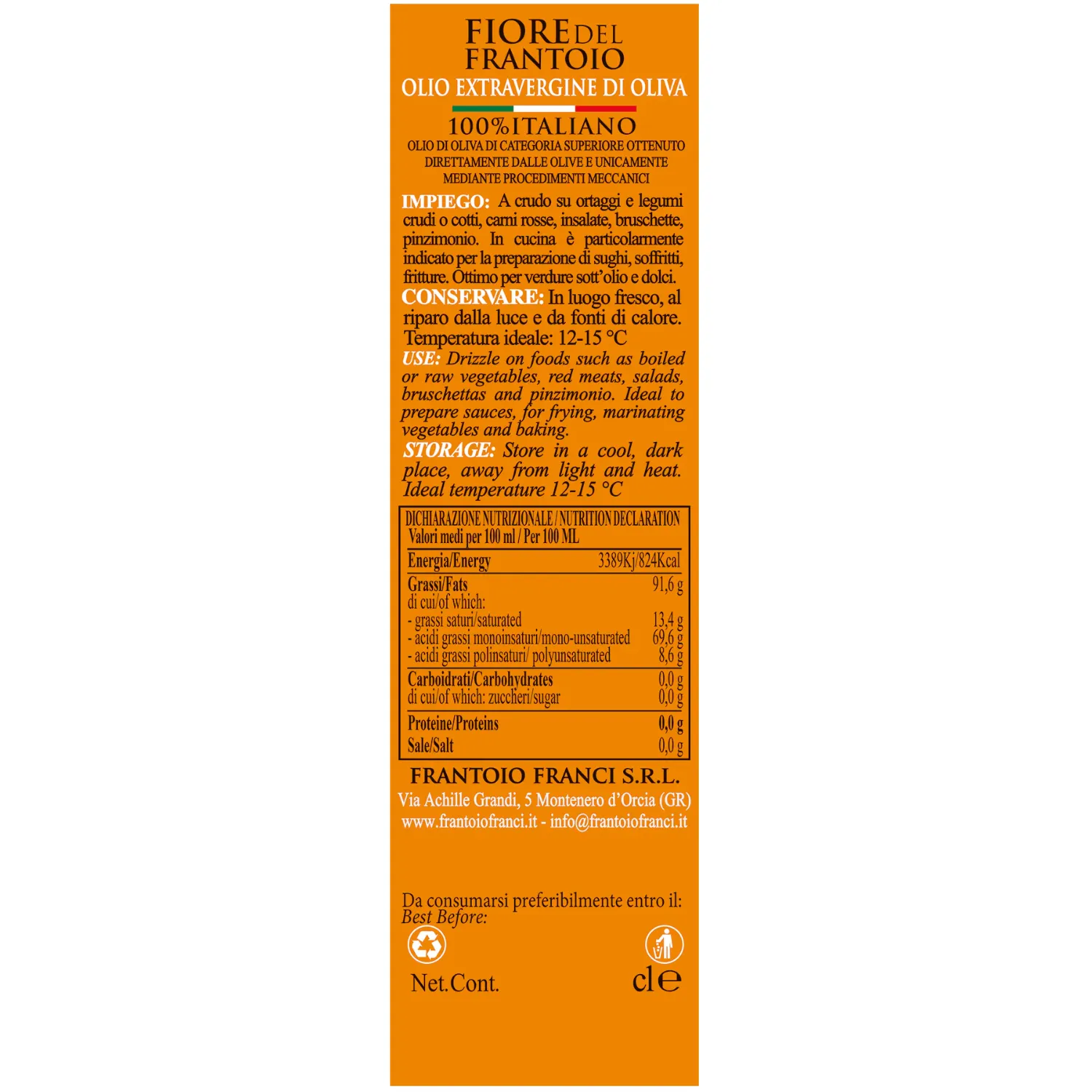 Premiato e riconosciuto a livello internazionale, Fiore del Frantoio incarna l’equilibrio perfetto tra gusto italiano e versatilità, diventando così il prodotto ideale per chi cerca ogni giorno qualità autentica e affidabile, senza rinunciare alla finezza del vero olio EVO toscano. Una sintesi di tradizione e gusto che conquista le tavole di tutto il mondo.