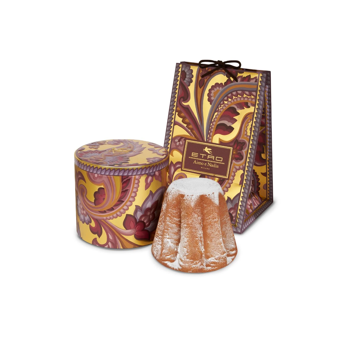Il Pandoro ETRO x Aimo e Nadia Milano è un dolce della tradizione veronese, reinterpretato con eleganza. Preparato nel rispetto della storica ricetta, questo pandoro artigianale si presenta in un’elegante scatola di latta decorata con gli iconici motivi Paisley di ETRO, dai colori tenui e avvolgenti che richiamano la delicatezza del dolce lievitato.