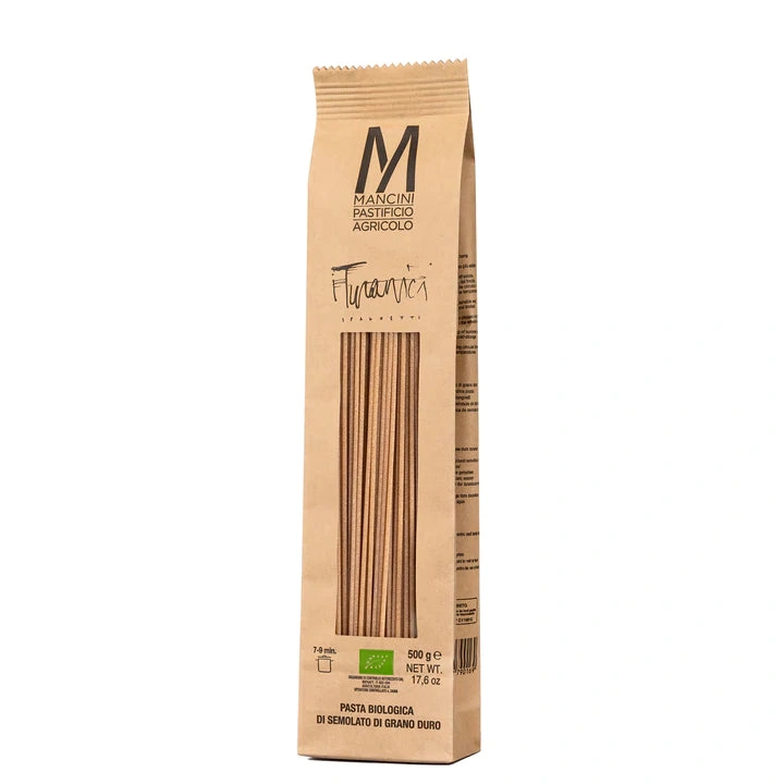 Il grano turanico appartiene al grande gruppo dei frumenti duri. La classificazione esatta è Triticum turgidum subspecie Turanicum, comunemente T. turanicum. È originaria della regione del Khorasan (Nord-Est dell’Iran), diffusa nel Bacino del Mediterraneo e anche in Italia, è stata dimenticata in tempi  moderni. Prometeo di Urbino e l’Azienda Agricola Mancini, in collaborazione con l’agronomo esperto di cereali Oriana Porfiri, hanno organizzato una filiera produttiva dal seme fino alla pasta. Il risultato è lo spaghetto turanico di Pasta Mancini, dal colore della terra e dallo spiccato odore di grano in cottura. Gli spaghetti turanici sono lunghi 260mm ed hanno un diametro di 2,2 mm. Il tempo di cottura è di 7-9 minuti. Analisi qualitative e valutazioni sensoriali hanno evidenziato un basso contenuto in glutine di struttura “soft”, facilmente digeribile, quindi adatto anche a soggetti con disturbi digestivi. Data la delicatezza della sua struttura, si raccomanda un passaggio veloce in padella durante la mantecatura per mantenere inalterati consistenza e gusto.