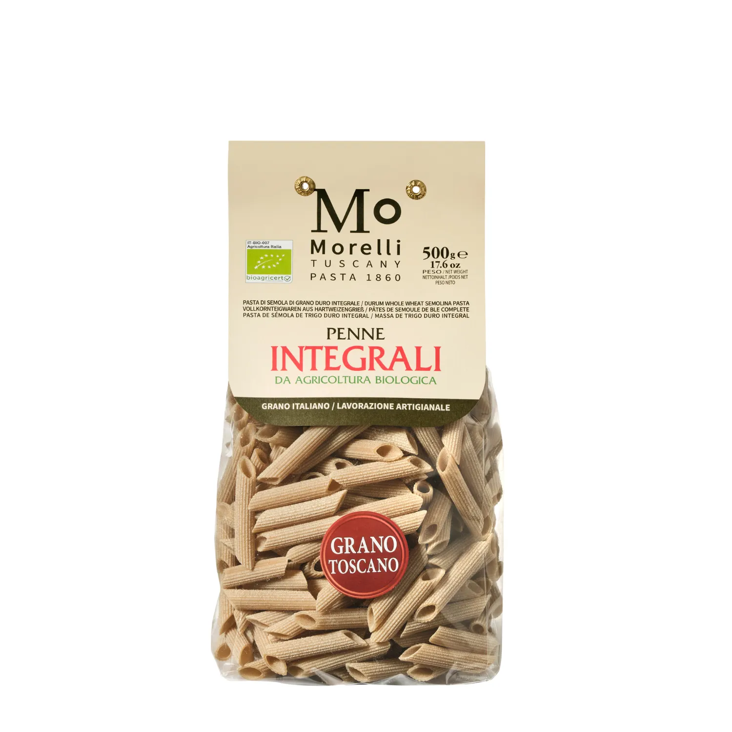 Le Penne Integrali BIO di Antico Pastificio Morelli sono prodotte con semola di grano duro integrale e acqua. Una pasta ricca di fibre e nutrienti, dal gusto rustico e naturale, che mantiene un’ottima tenuta in cottura. Grazie alla loro consistenza corposa e al sapore autentico del grano, sono ideali per accompagnare piatti leggeri e ricette tradizionali. Tempo di cottura: 7/8 minuti.