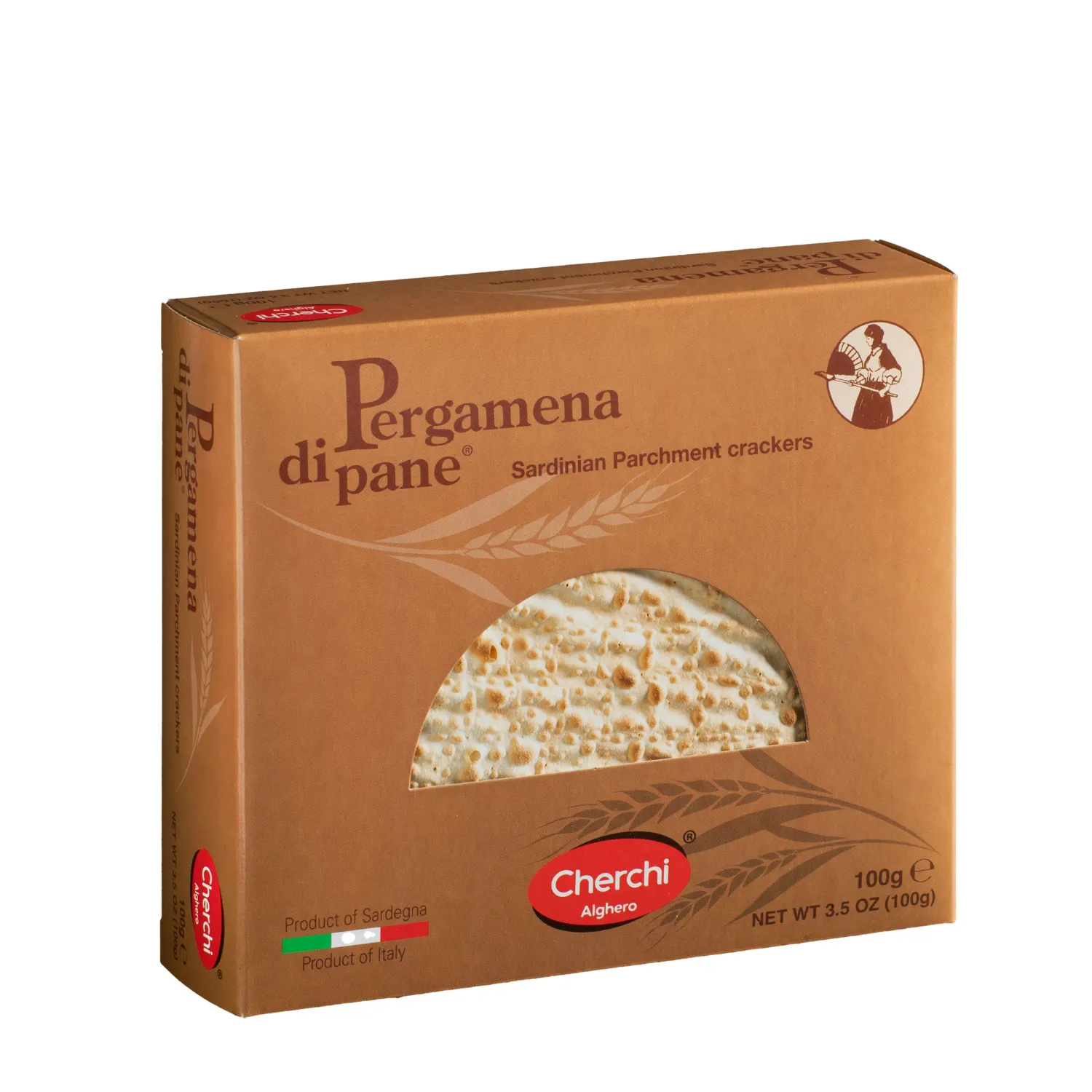 Sottilissima, croccante e di colore dorato, la pergamena di pane accompagna bene ogni pietanza: dai salumi ai formaggi, dalla carne al pesce, dalle confetture alla cioccolata.