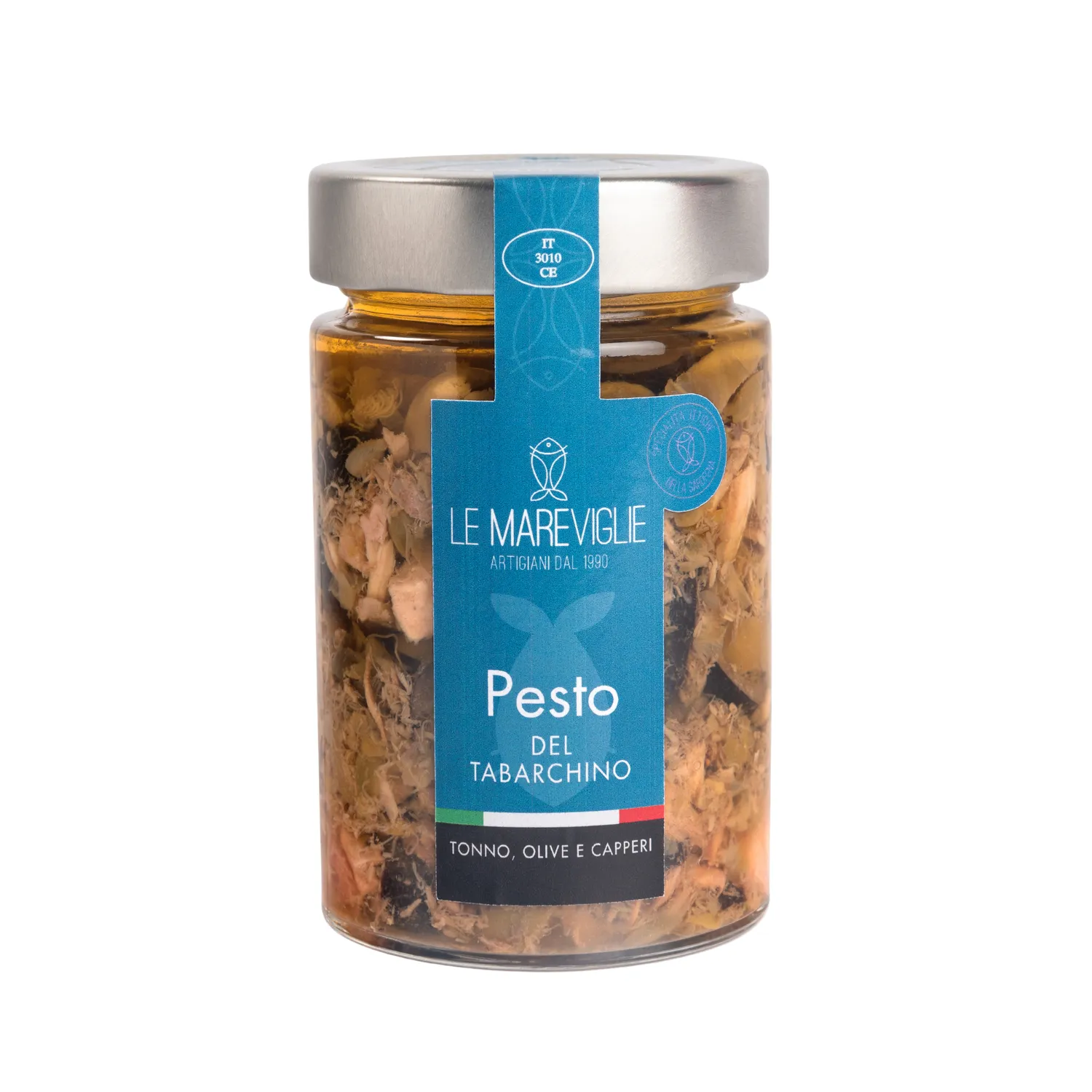 Il Pesto del Tabarchino di Le Mareviglie da 190 g è una ricetta autentica ispirata alla tradizione gastronomica dell’isola di San Pietro. Preparato con tonno pinne gialle (35%), olive nere e verdi (19%), capperi (7%) e olio d’oliva, è un condimento intenso e saporito, perfetto per primi piatti o crostini. Lavorato artigianalmente e sterilizzato per garantire sicurezza e conservazione, si distingue per l’equilibrio tra gli ingredienti e la qualità senza compromessi.