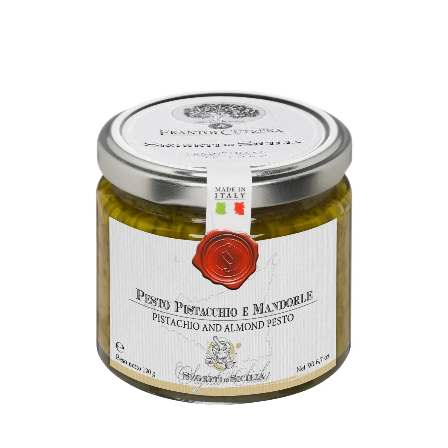 Il Pesto Pistacchio e Mandorle è una gustosa specialità siciliana preparata con frutta secca selezionata, formaggio “Cosacavaddu” e olio extravergine di oliva Frantoi Cutrera. La consistenza cremosa è arricchita da pezzi croccanti di pistacchio e mandorla, mentre il sapore intenso ed equilibrato rende questo condimento perfetto per esaltare primi piatti, bruschette e secondi. Un prodotto genuino, senza conservanti né coloranti, che racchiude tutta la bontà della tradizione siciliana.