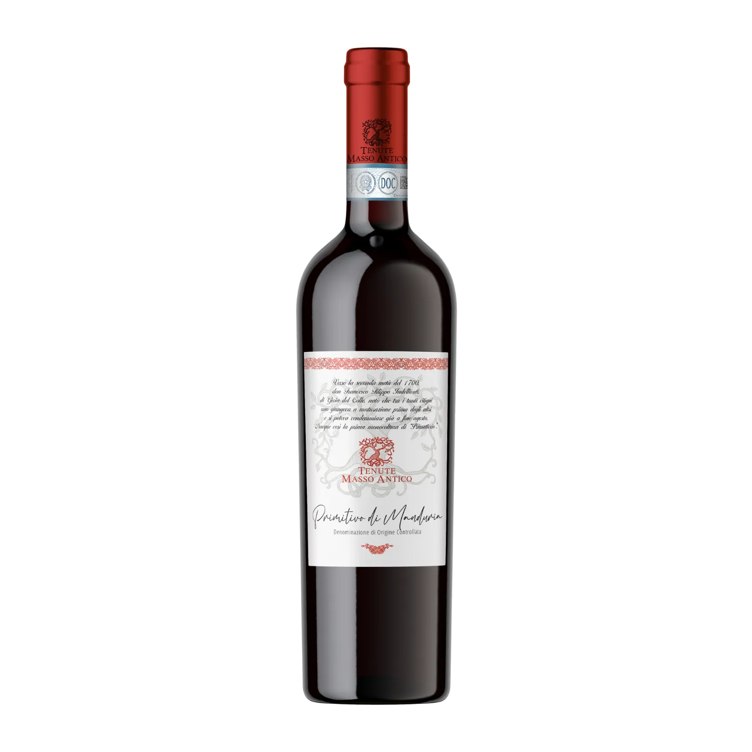 Il Primitivo di Manduria DOC di Masso Antico è un vino rosso strutturato e potente, prodotto da uve coltivate nel cuore della Puglia. Si distingue per i suoi aromi intensi di frutti di bosco, prugne mature e leggere note speziate. Al palato è morbido e vellutato, con un perfetto equilibrio tra acidità e tannini dolci.