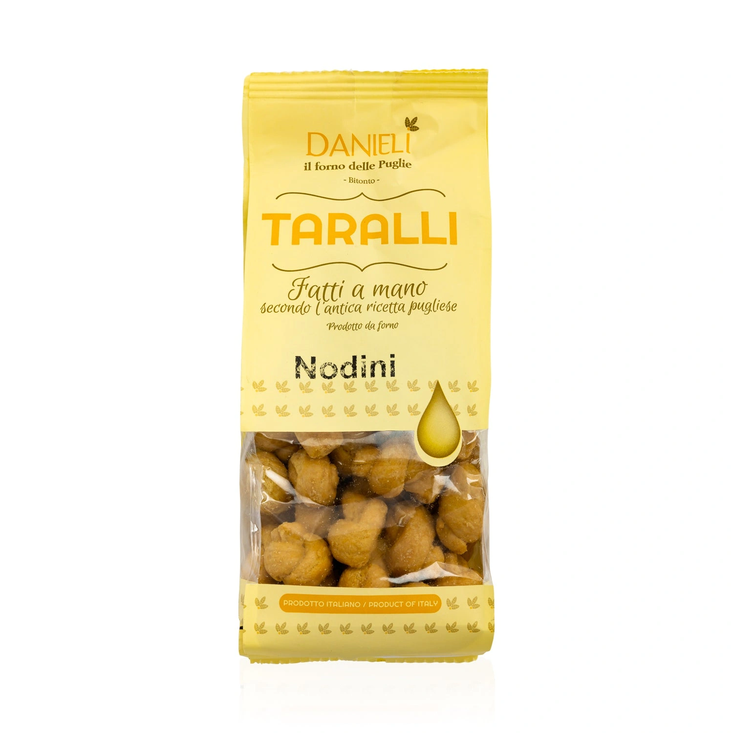 I nodini Danieli sono uno snack gustoso e croccante, che appaga qualsiasi voglia di golosità. Grazie all’utilizzo di materie prime come la farina proveniente dal tavoliere di Puglia, o come l’olio extra vergine di oliva, ed evitando accuratamente l’utilizzo di conservanti, Danieli sforna prodotti di bontà eccelsa, seguendo alla lettera il loro motto: “Qualità a tutti i costi!”.