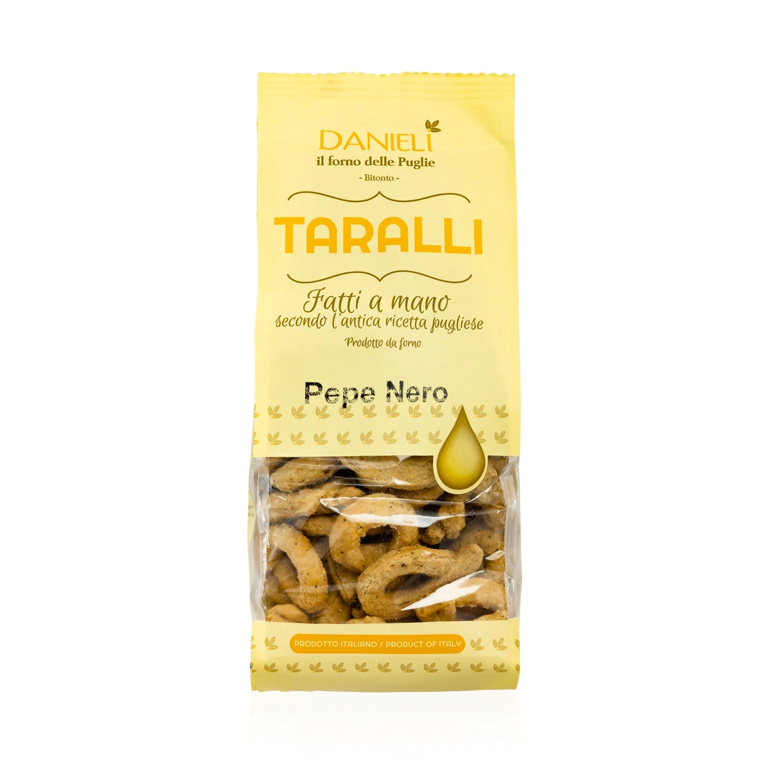 Taralli al pepe nero e all’olio extra vergine di oliva prodotti rigorosamente a mano, bolliti e infornati come da antiche tradizioni.