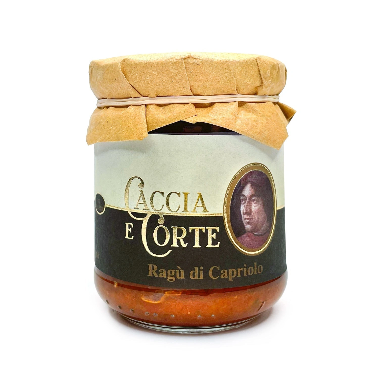 Ingredienti Polpa di pomodoro, carne di capriolo 35%, olio extravergine di oliva 100% italiano, cipolle rosse, carote, vino rosso, sedano, prezzemolo, sale, spezie (frutti di coriandolo, cannella, chiodi di garofano, noce moscata, zenzero), uva sultanina, pinoli, pep