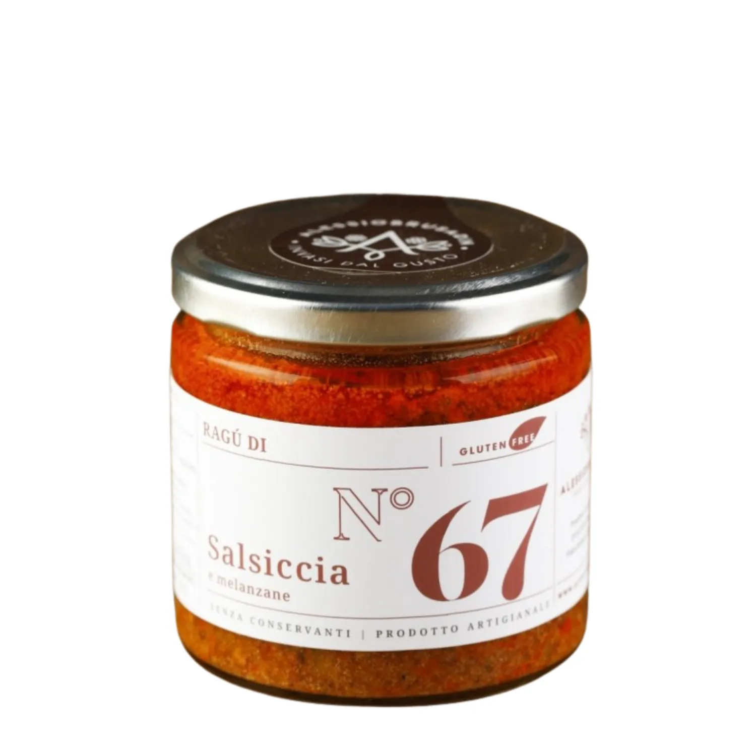 Ragù rustico preparato con salsiccia italiana e melanzane, cucinato lentamente con pomodoro e aromi mediterranei. Ideale per condire pasta corta, lasagne o piatti della cucina tradizionale. Prodotto artigianale, senza conservanti, origine Italia.