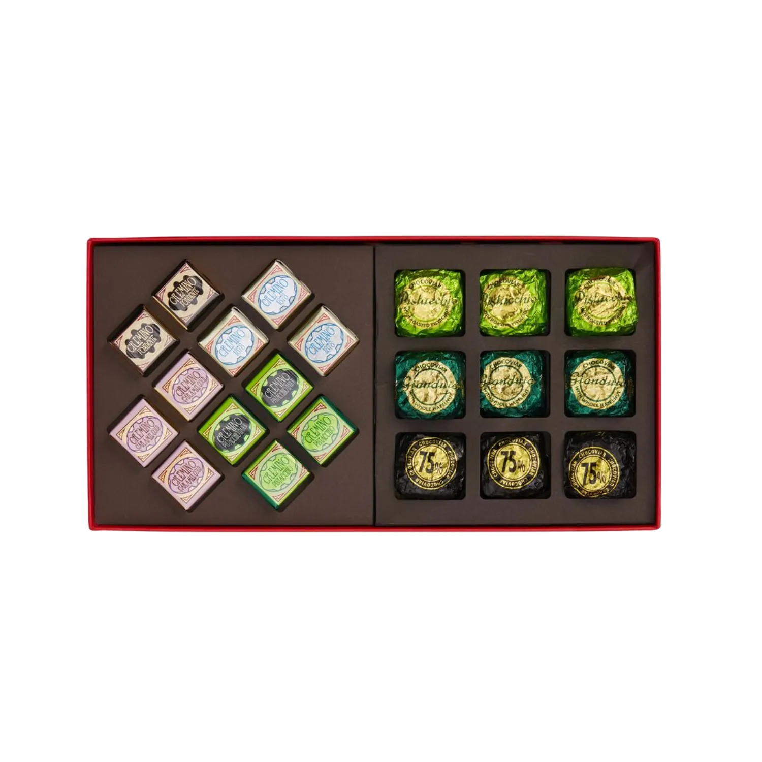 | Ingredienti | Zucchero 27,09%, burro di cacao 19,34%, massa di cacao 14,27%, cacao in polvere 10,62%, latte intero in polvere 8,10%, pasta di nocciola Piemonte IGP 7,82%, pasta di mandorle 5,85%, pasta di pistacchio 3,34%, oli e grassi vegetali (olio di girasole, burro di cacao, olio di oliva) 1,21%, nocciola Piemonte IGP 1,04%, siero di latte in polvere 0,43%, emulsionante: lecitina di soia 0,35%, grasso di latte anidro 0,21%, caramello in polvere (latte scremato in polvere, siero di latte in polvere, zucchero, grasso di latte, aroma naturale di vaniglia) 0,17%, emulsionante: lecitina (girasole, colza) 0,07%, aroma naturale di vaniglia 0,05%, aroma naturale 0,03%, sale 0,01%. |