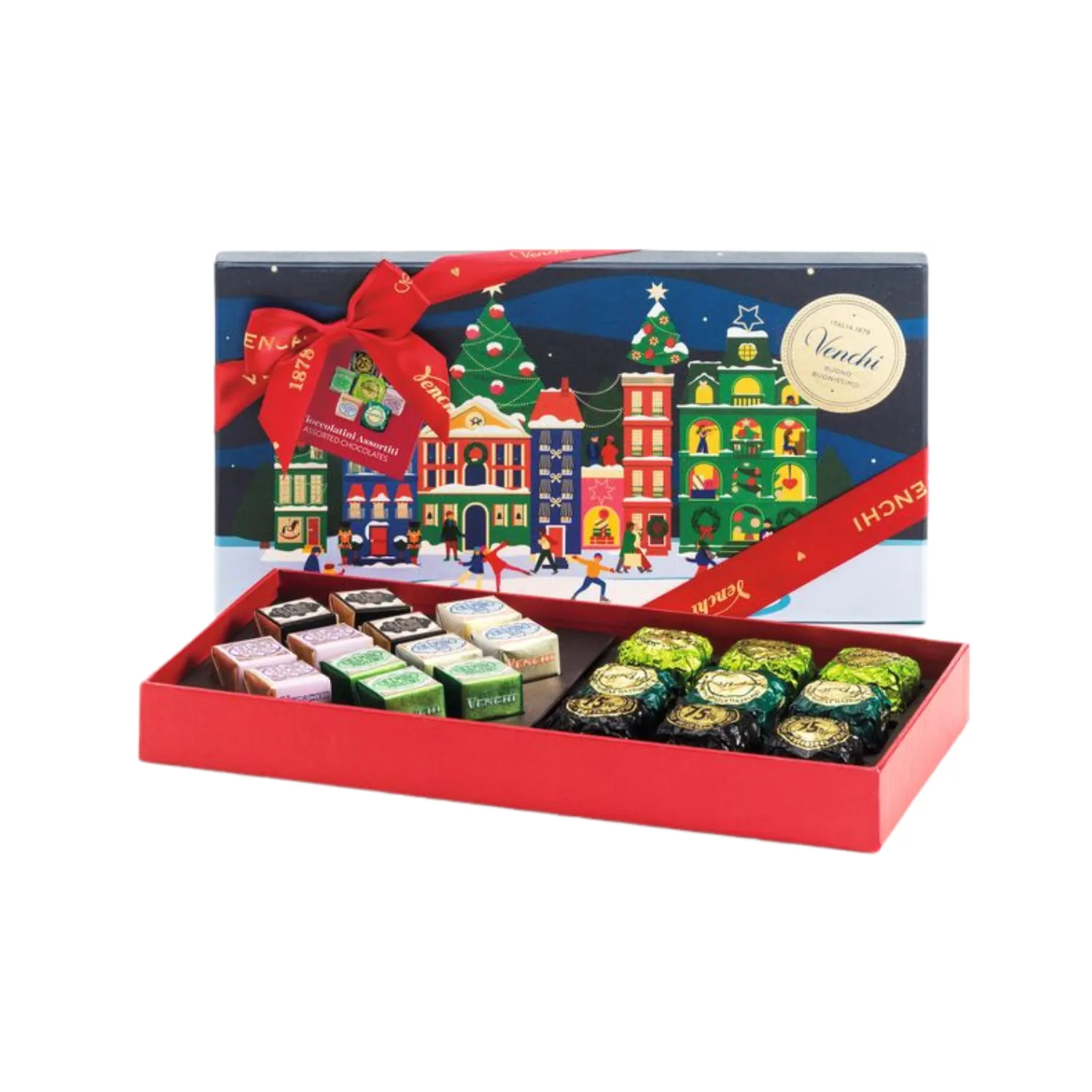 La Scatola Regalo di Natale Alice di Venchi è una confezione elegante e colorata che racchiude una selezione di 8 prelibati cioccolatini assortiti. Creata per celebrare le festività natalizie, unisce la tradizione piemontese del cioccolato alla creatività Venchi. Realizzati con cacao di alta qualità, Nocciole Piemonte IGP, mandorle e pistacchi, questi cioccolatini rappresentano un perfetto equilibrio tra gusto, eleganza e artigianalità. Ideale come dono raffinato per gli amanti del cioccolato.