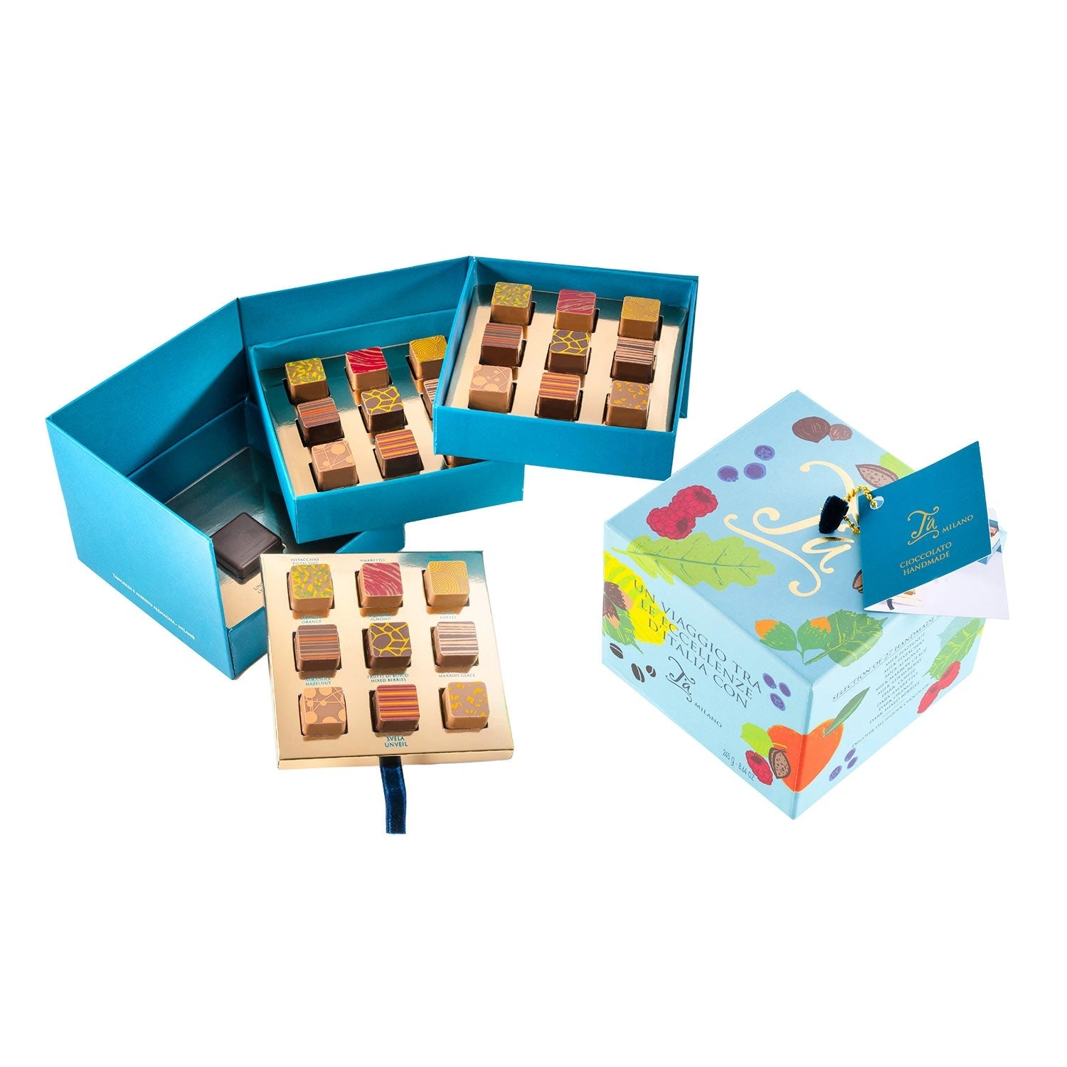 Questa colorata confezione contiene 27 gustose praline, al latte e fondenti, con ripieni assortiti, un vero e proprio viaggio tra le eccellenze d’Italia con la Nocciola Piemonte IGP, il pistacchio e la mandorla di Sicilia, la fragola veneta e i marron glacé piemontesi. Questo prezioso scrigno a 3 piani nasconde sul fondo un segreto: un cioccolatino e un messaggio che si riveleranno solo ai consumatori più golosi.