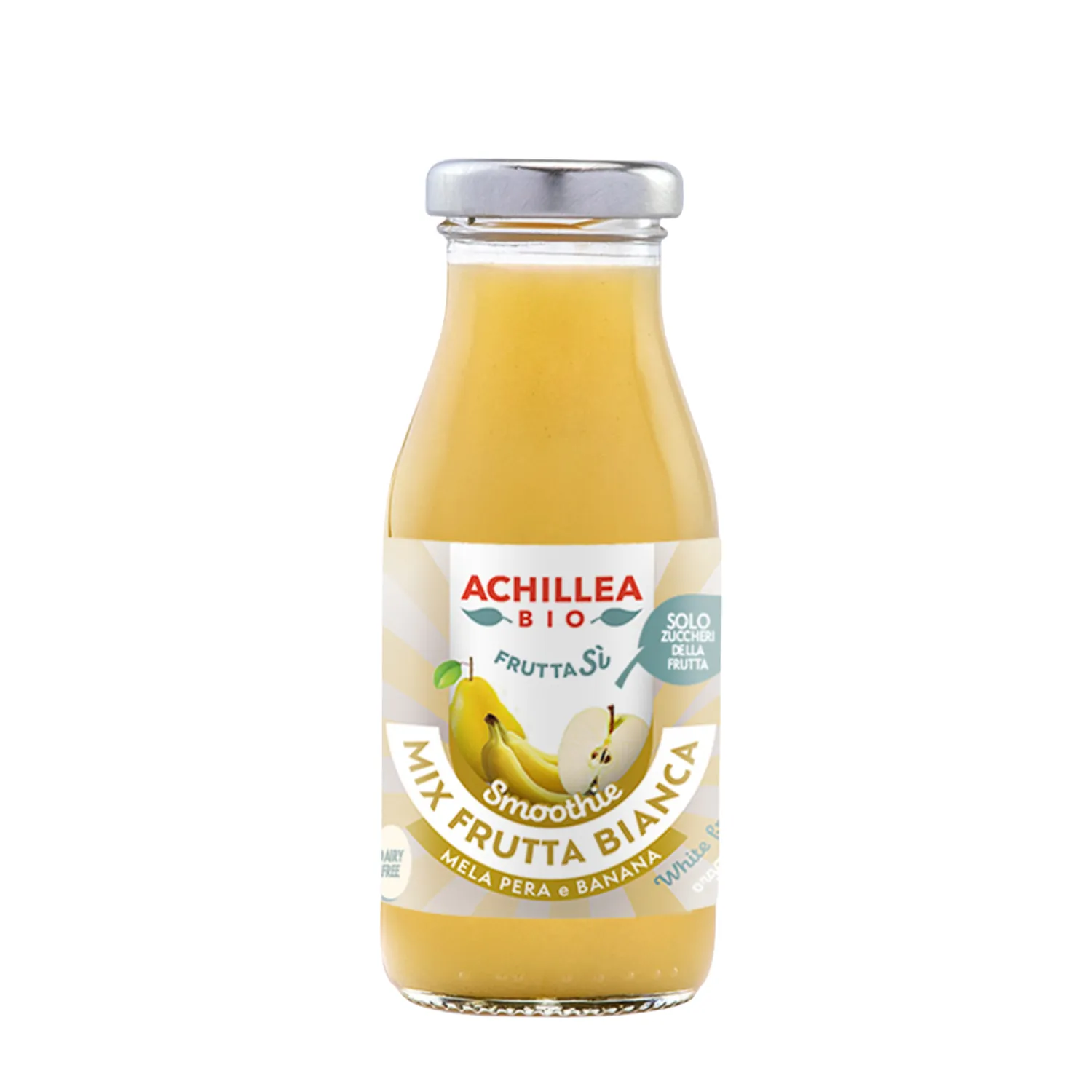 Lo Smoothie Mix Frutta Bianca Achillea è una bevanda biologica ottenuta da puree e succhi concentrati di pera Williams, mela e banana. Dalla consistenza densa e vellutata, presenta un colore bianco avorio e un profumo fruttato con note dolci di frutti maturi. Ideale per una pausa naturale e gustosa, è un prodotto biologico, senza glutine e senza OGM.