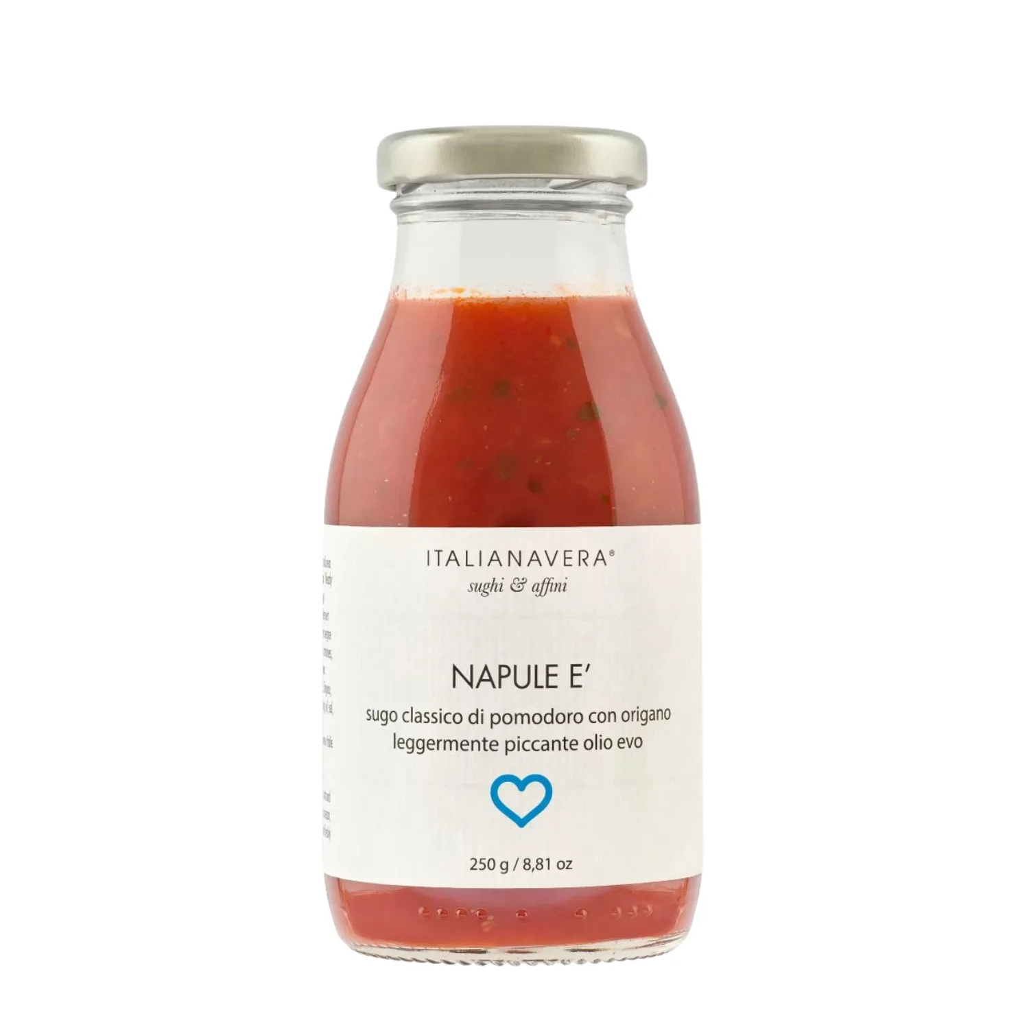 Napule è è un sugo di pomodoro biologico, ispirato alla ricca tradizione napoletana, prodotto da Italianavera. Questo sugo celebra il cuore della cucina partenopea con pomodori biologici coltivati nelle terre fertili della Campania, lavorati con passione e metodi tradizionali. Il nome “Napule è” richiama il legame profondo con la città di Napoli, famosa per la sua gastronomia, i suoi sapori intensi e la convivialità della tavola.