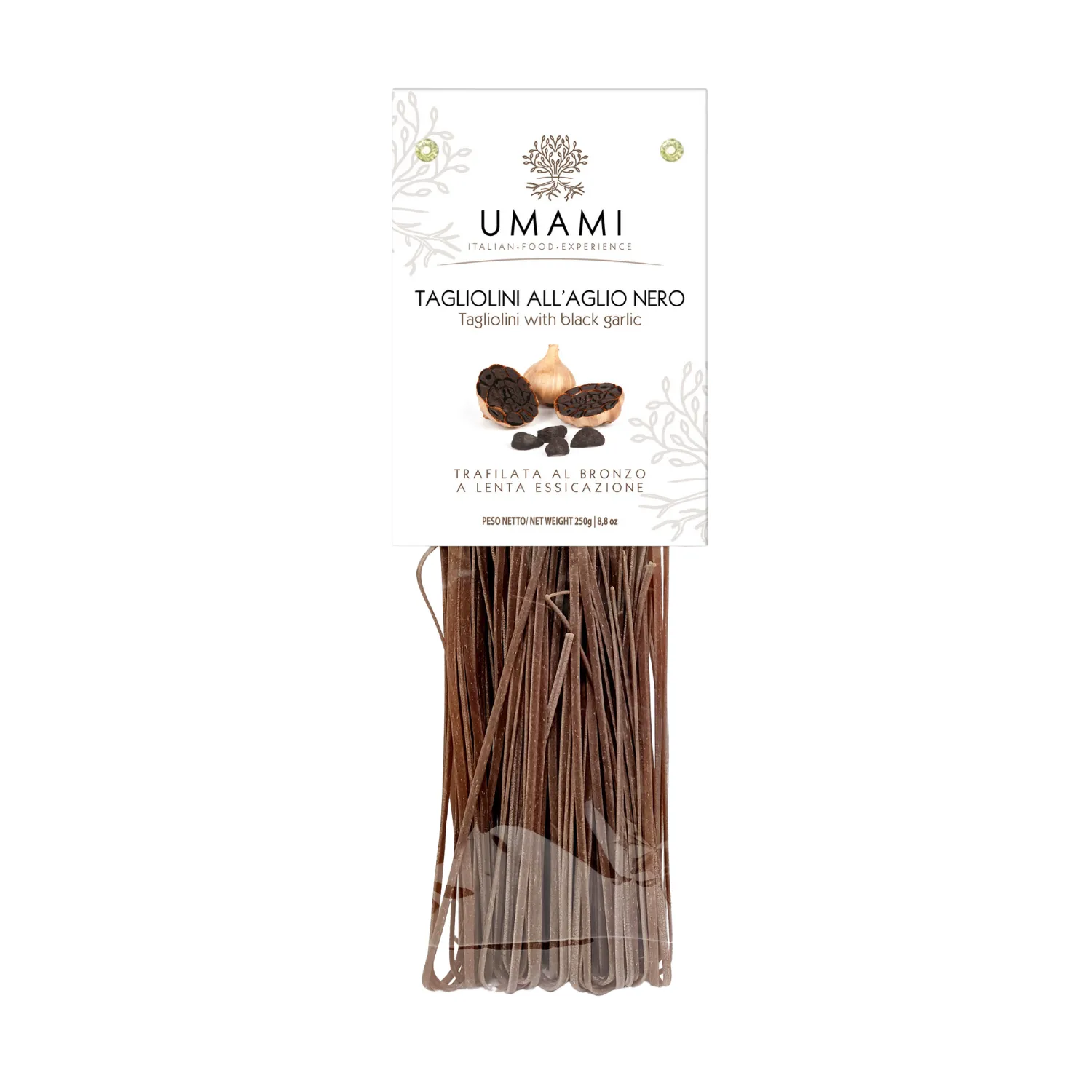 I Tagliolini all’aglio nero Umami sono una pasta artigianale di alta qualità realizzata con semola di grano duro e aglio nero fermentato. Il sapore unico e intenso dell’aglio nero dona a questo formato una nota umami ricercata, perfetta per piatti raffinati e sorprendenti. Essiccati lentamente a bassa temperatura per mantenere intatte le proprietà organolettiche.