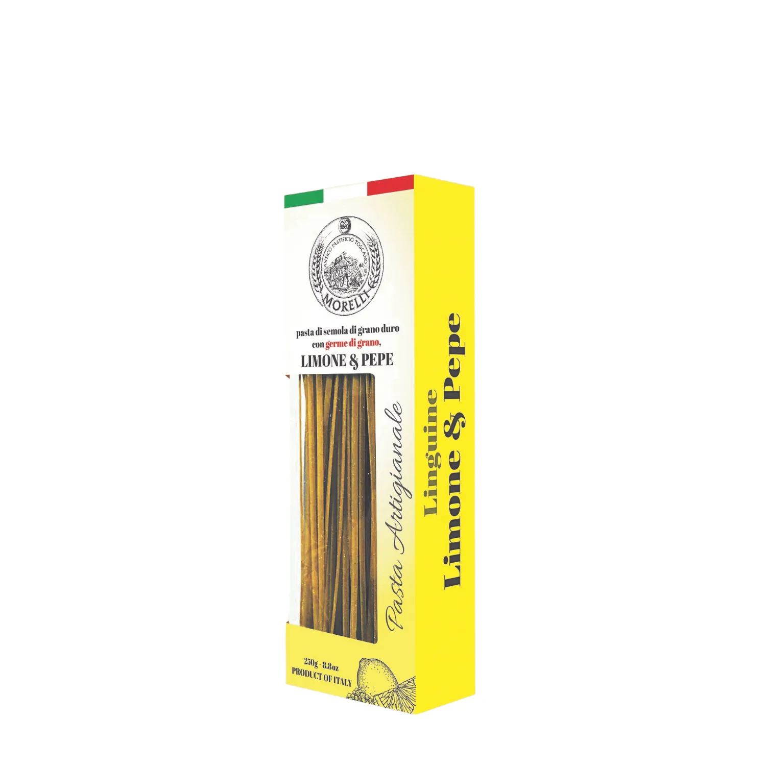 I Tagliolini Limone e Pepe di Antico Pastificio Morelli sono una pasta artigianale ottenuta da semola di grano duro e germe di grano, arricchita con aroma naturale e succo concentrato di limone in polvere e pepe nero. Il loro gusto agrumato e leggermente piccante li rende ideali per ricette fresche e raffinate. La presenza del germe di grano fresco dona un sapore autentico e lascia l’acqua di cottura leggermente verde, segno distintivo della qualità Morelli. Tempo di cottura: 5-6 minuti.