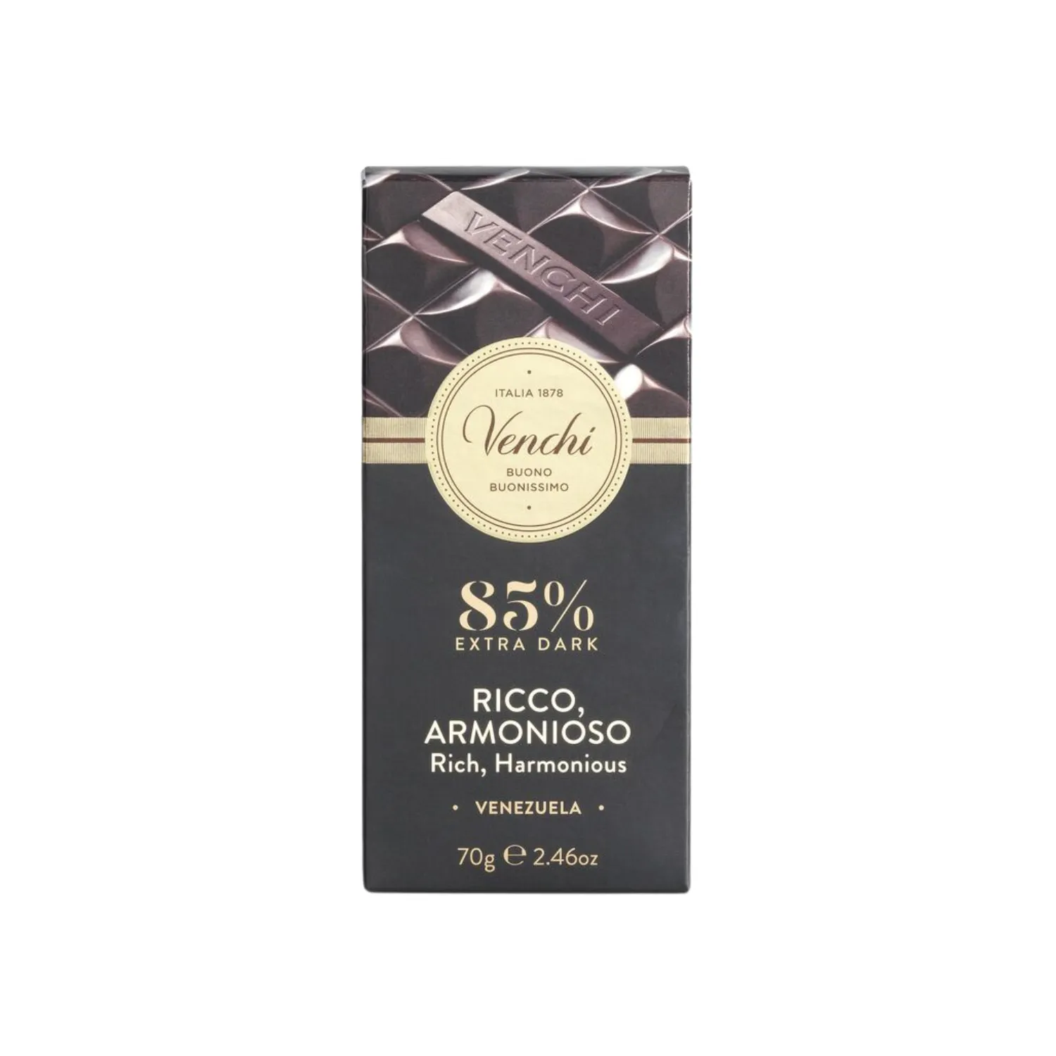 La Tavoletta fondente 85% del Venezuela di Venchi è un’esperienza di gusto intensa e sofisticata, dedicata ai veri amanti del cioccolato fondente. Ottenuta esclusivamente da cacao monorigine del Venezuela, sprigiona un bouquet aromatico complesso, con note di frutta secca, tabacco, spezie e un elegante accenno floreale. L’alta percentuale di cacao (85%) regala una struttura decisa, vellutata e persistente, per una degustazione che conquista i sensi con autenticità e raffinatezza.