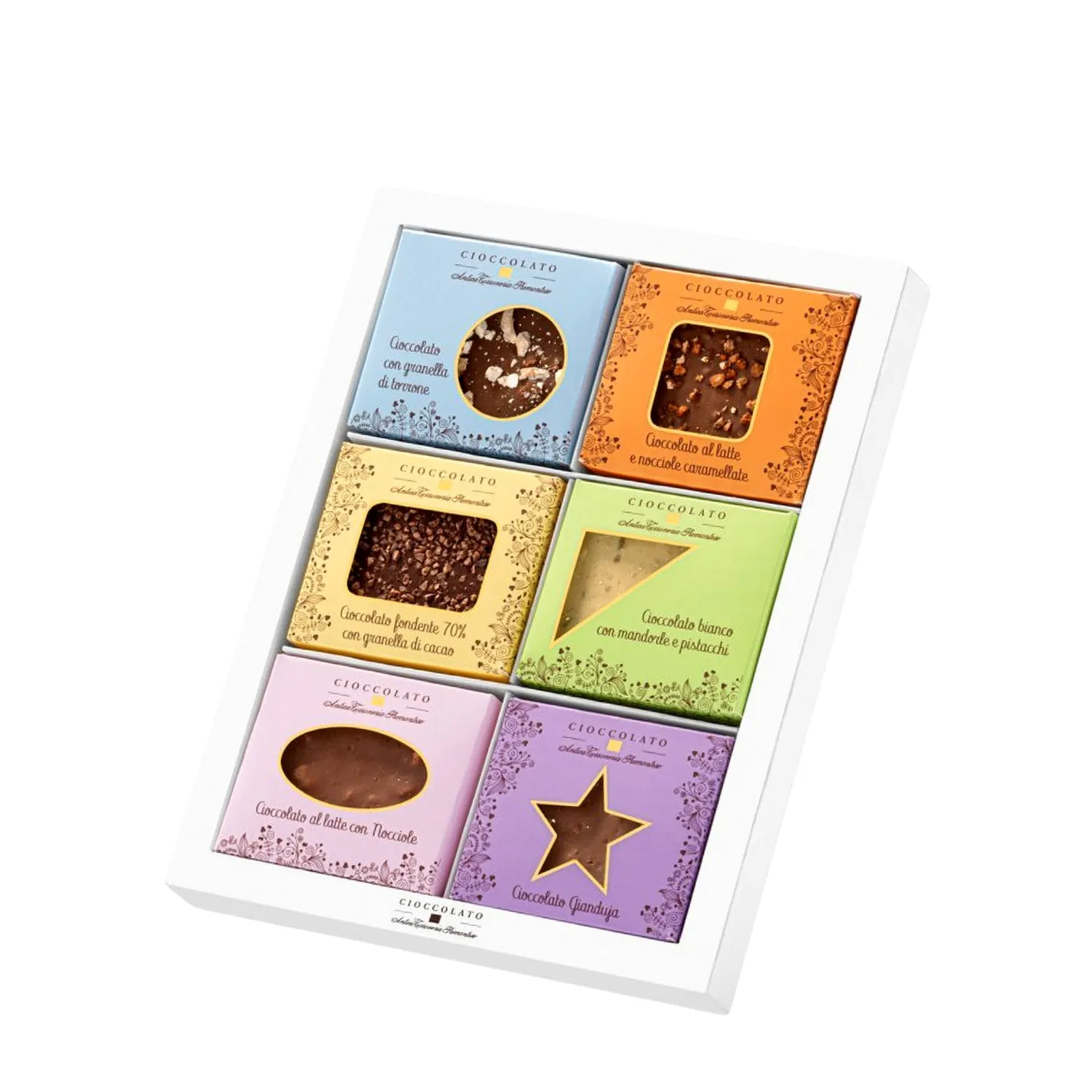 La Confezione Degustazione Maxi dell’Antica Torroneria Piemontese è una raffinata selezione di sei mini tavolette artigianali di cioccolato, realizzate con ingredienti di alta qualità e senza glutine. Ogni tavoletta rappresenta una variazione di gusto: latte con nocciole, fondente 70% con fave di cacao, bianco con mandorle e pistacchi, latte gianduia con nocciole intere, latte con granella di nocciole caramellate e latte con granella di torrone. Un viaggio sensoriale tra consistenze e aromi unici, ideale per chi ama il cioccolato in tutte le sue sfumature.